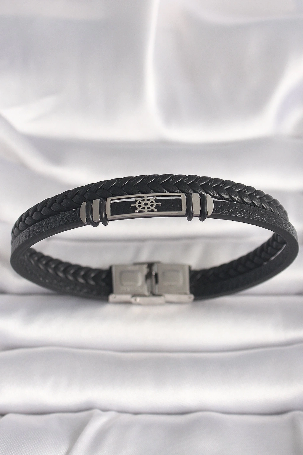 BFS 316L Çelik Gümüş Renk Gemi Dümeni Figür Siyah Burgu Deri Kordon Model Erkek Bileklik