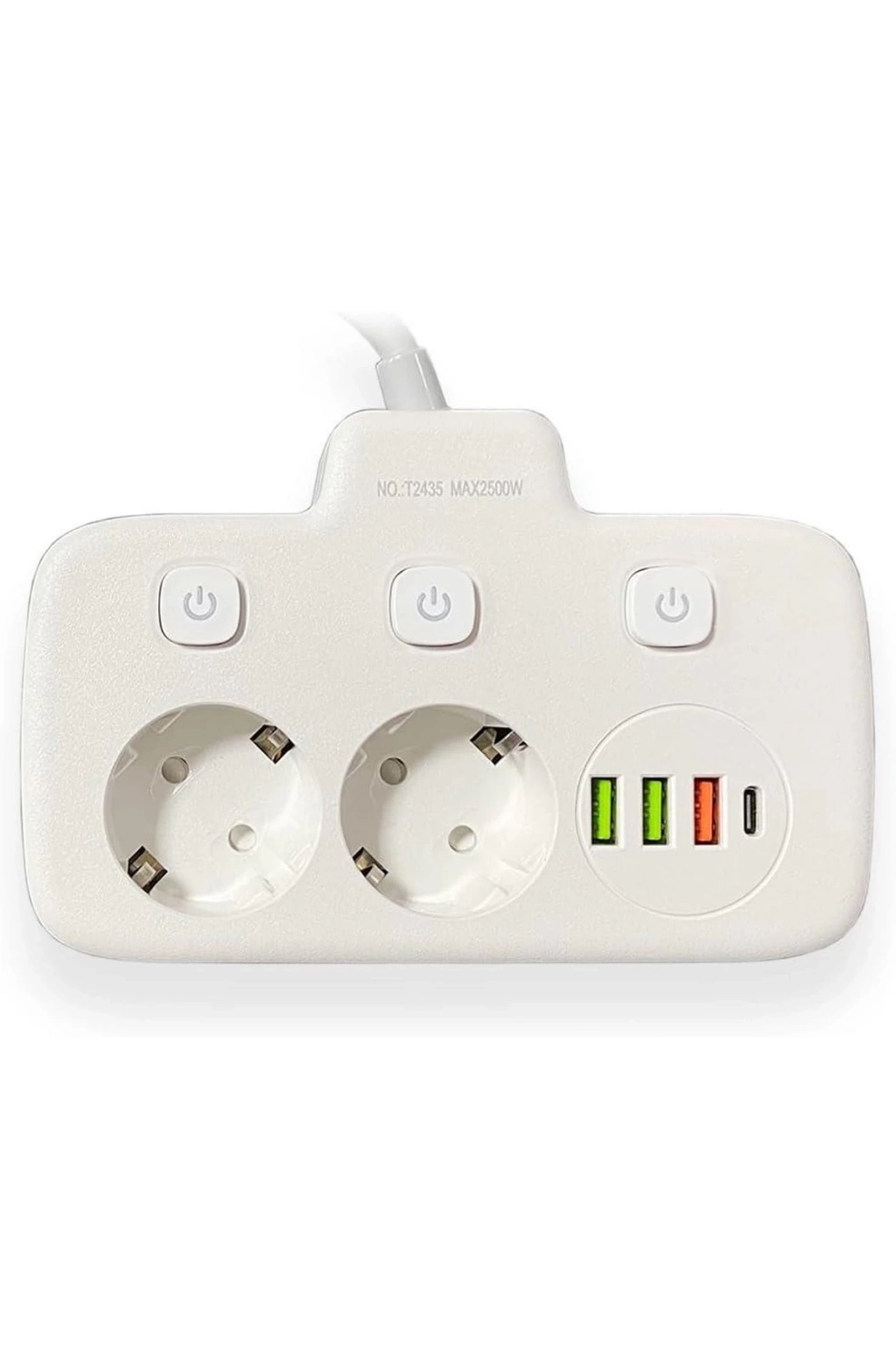 Akım Korumalı 2'li Ayrı Anahtarlı Priz, 2x Priz, 3x USB, 1x Type-C, 2 mt Kablo, Hızlı Şarj