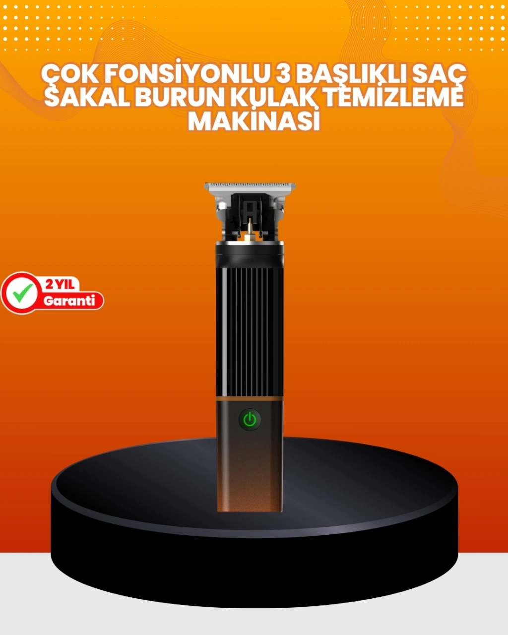 Modern erkeklerin bakım ihtiyacını tek cihazda karşılayan bu 3 in 1 şarjlı bakım seti, saç, sakal ve burun tüylerini profesyonel düzeyde kesmek için tasarlanmıştır.Paslanmaz çelik bıçaklar, uzun ömürlü kullanım sunarken cilt dostu tasarımıyla tahrişi önler.7300 RPM motor, kalın saçlarda bile yüksek performans sağlar. Sessiz çalışma teknolojisi, gece ya da sabah erken saatlerde rahatsız etmeden kullanım olanağı tanır.Type-C şarj girişi, modern cihazlarla uyumludur ve 1,5 saatlik hızlı şarjla 90 dakika kablosuz kullanım imkânı verir.3 farklı başlık sayesinde saç, sakal, bıyık ve burun tüylerini zahmetsizce şekillendirebilirsiniz. R-şekilli güvenli bıçak ucu, cildi korurken temiz kesim sağlar.Kompakt boyutu sayesinde çantada kolay taşınır, seyahatlerde güvenilir bir yardımcı olur.Kutu içeriğinde; saç-sakal trimmer, burun trimmer, 3 tarak başlık, yağ, temizlik fırçası ve USB-C kablo bulunur.Şık tasarımı ve yüksek performansıyla kişisel bakımınızı profesyonel seviyeye taşır.