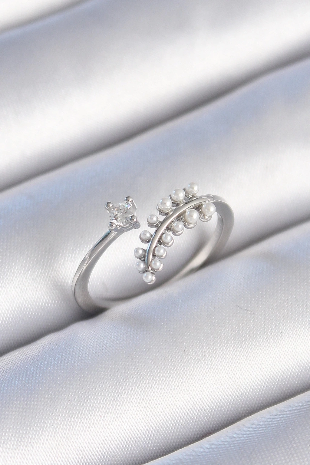 BFS Pirinç Gümüş Renk Zirkon Taşlı İncili Yaprak Model Kadın Yüzük