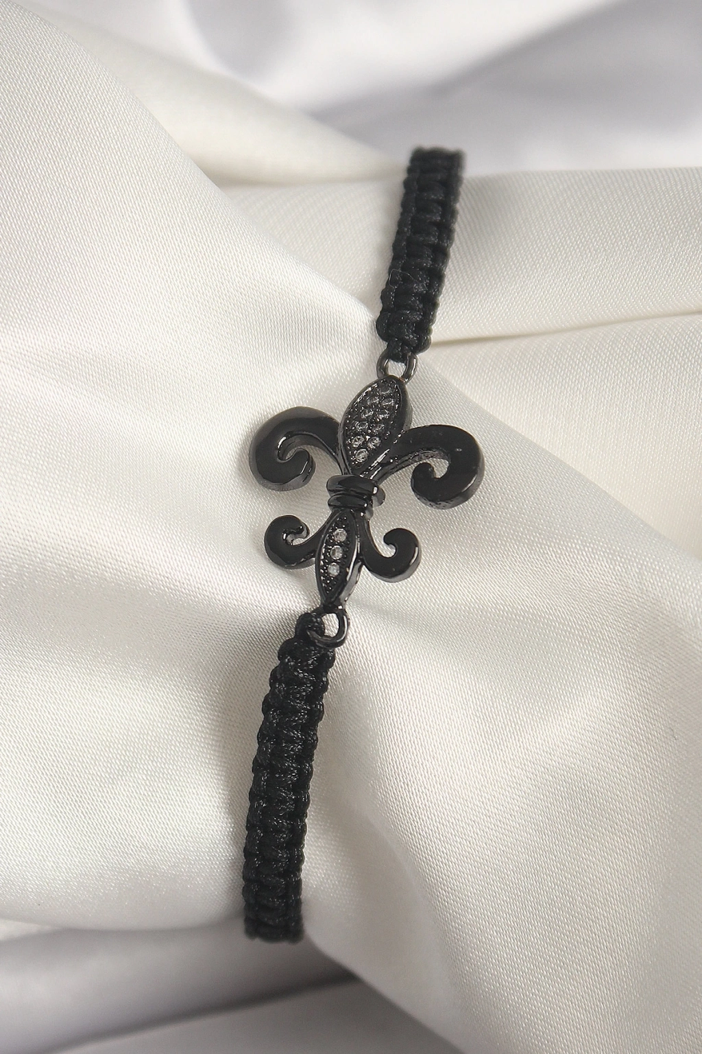 BFS Pirinç Siyah Renk Zirkon Taş İşlemeli Zambak Figür Asansörlü Makrome Model Kadın Bileklik