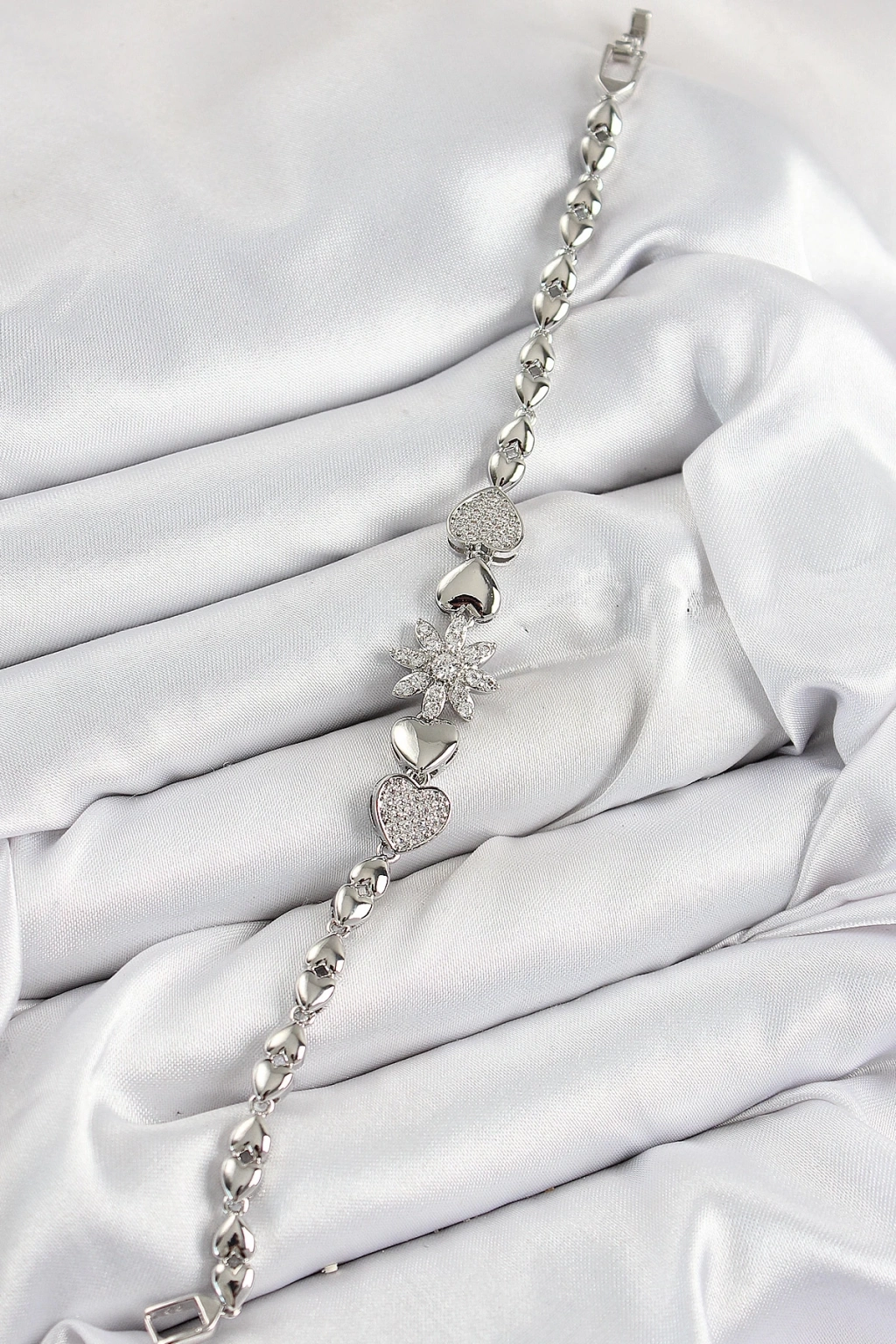 BFS Pirinç Zirkon Taşlı Kalp Detaylı Çiçek Model Gümüş Renk Kadın Bileklik