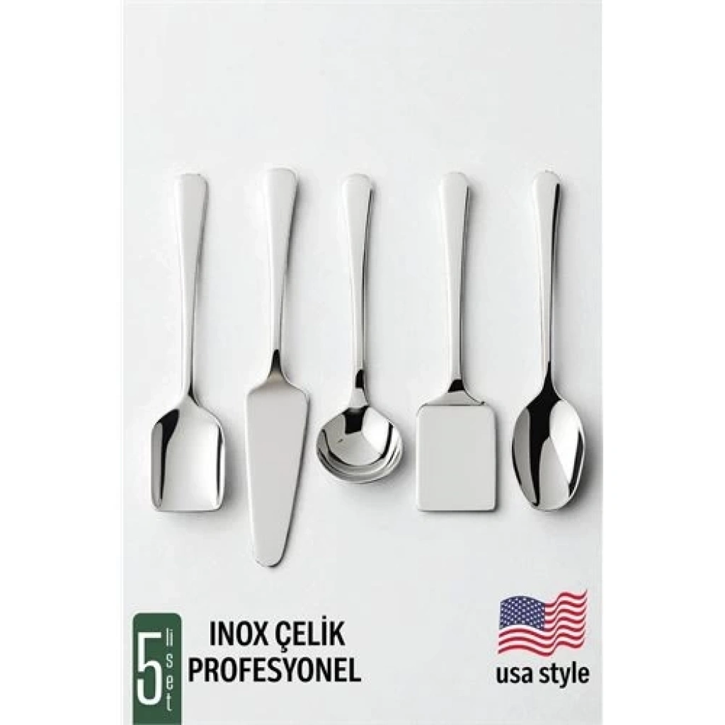 inox çelik mutfak seti, 5’li mutfak gereçleri, profesyonel mutfak ekipmanları, USA style mutfak seti, paslanmaz çelik servis seti, şef mutfak gereçleri, spatula kaşık kepçe seti