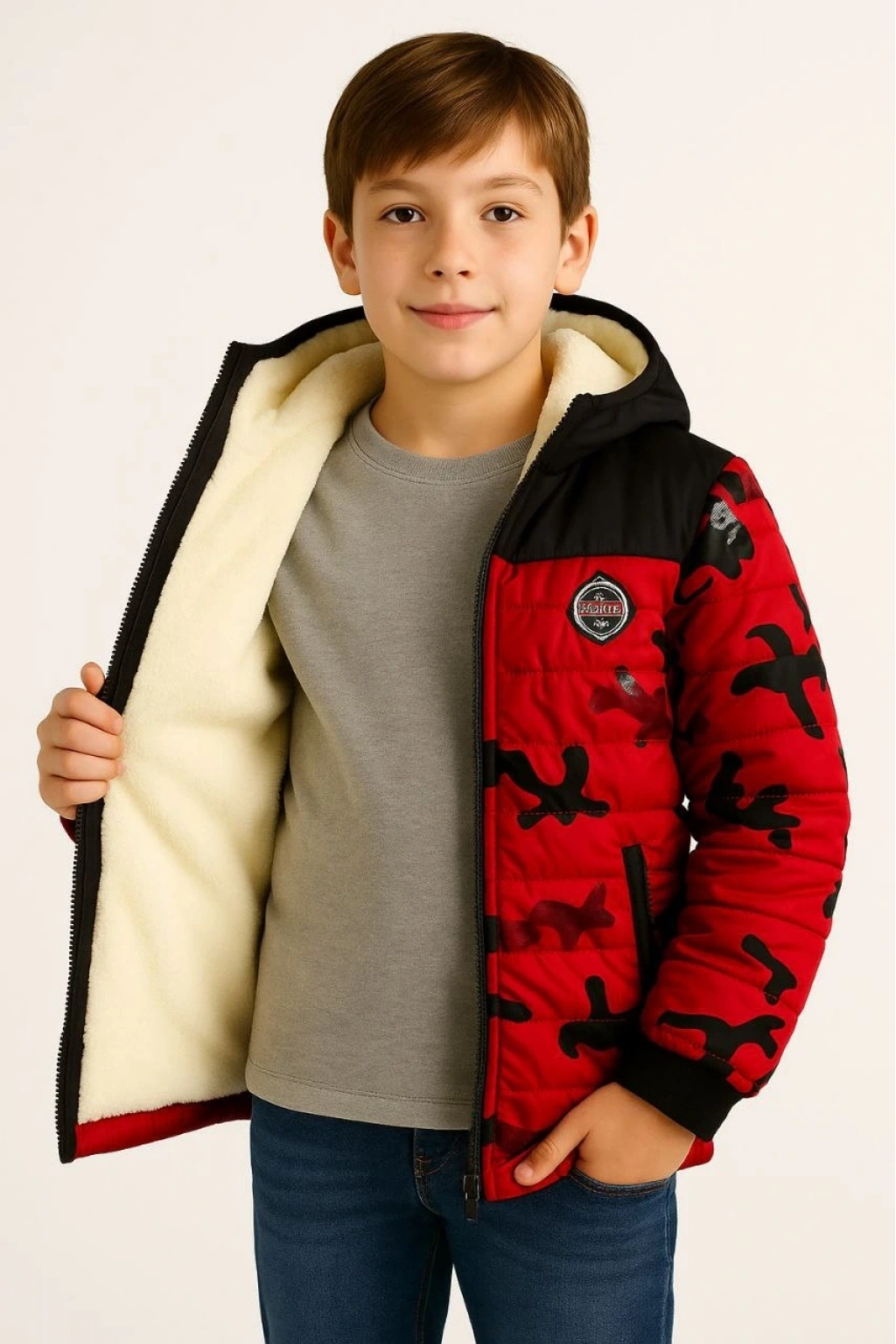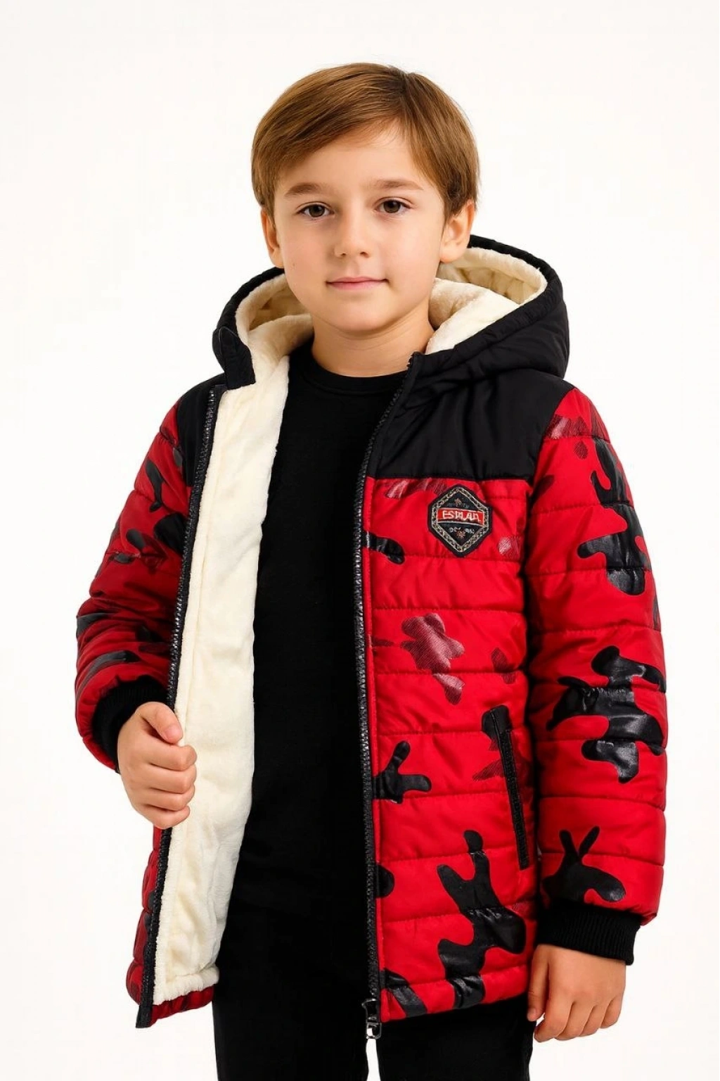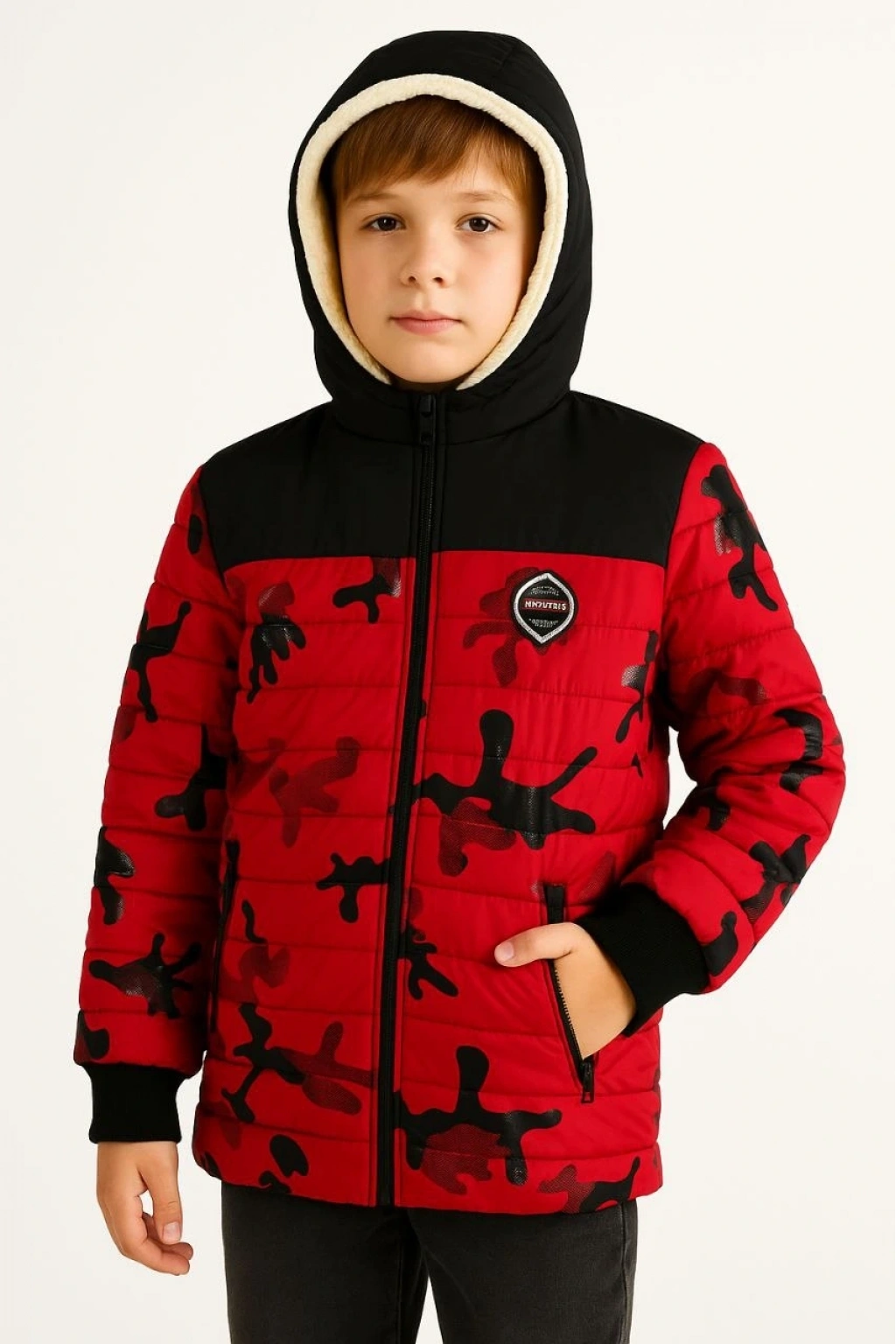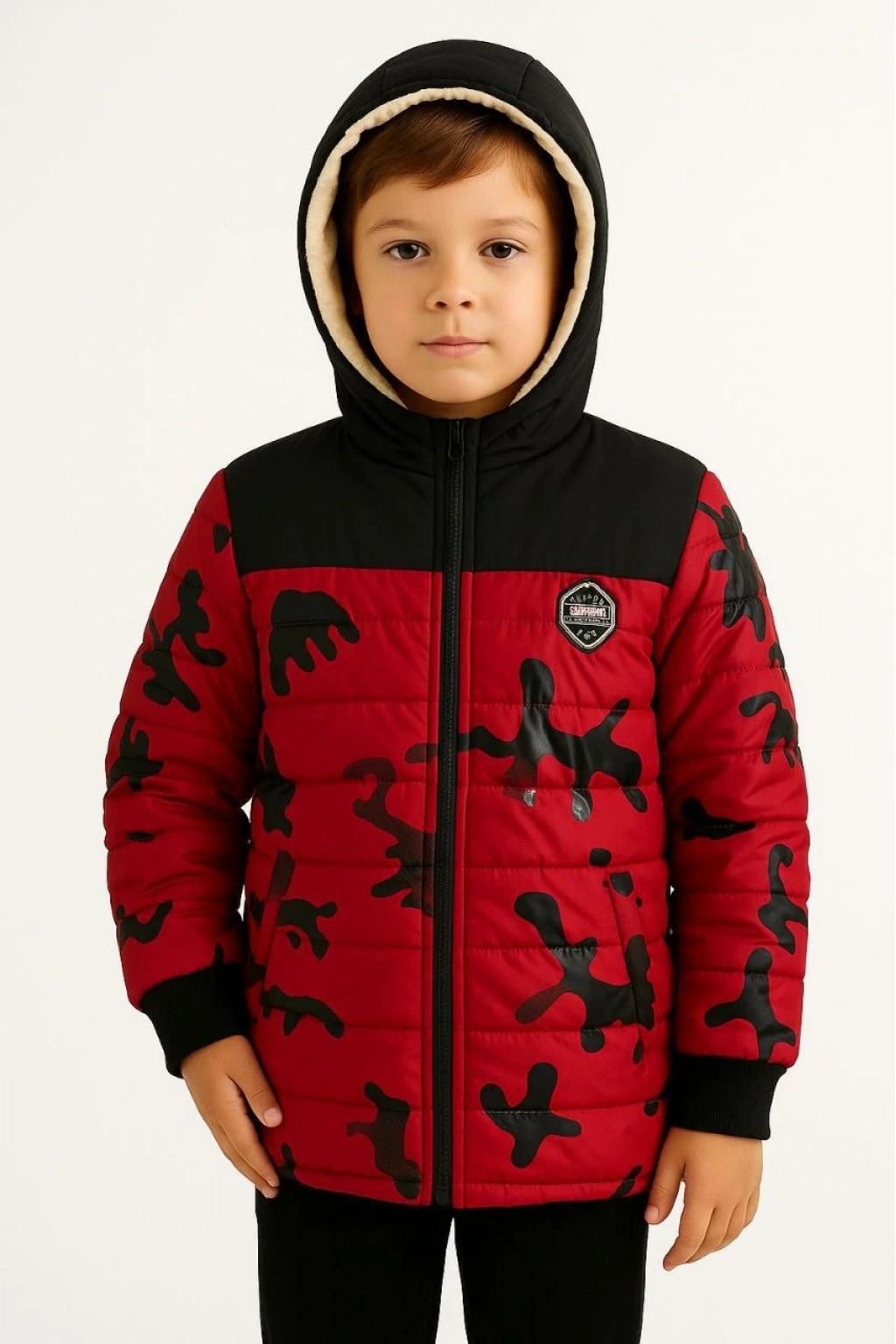 Kamuflaj Desenli Mont İçi Sıcak Tutan Pelüş Astarlı, Kapüşonlu, Fermuarlı Kışlık Su İtici Şişme Mont - Kırmızı