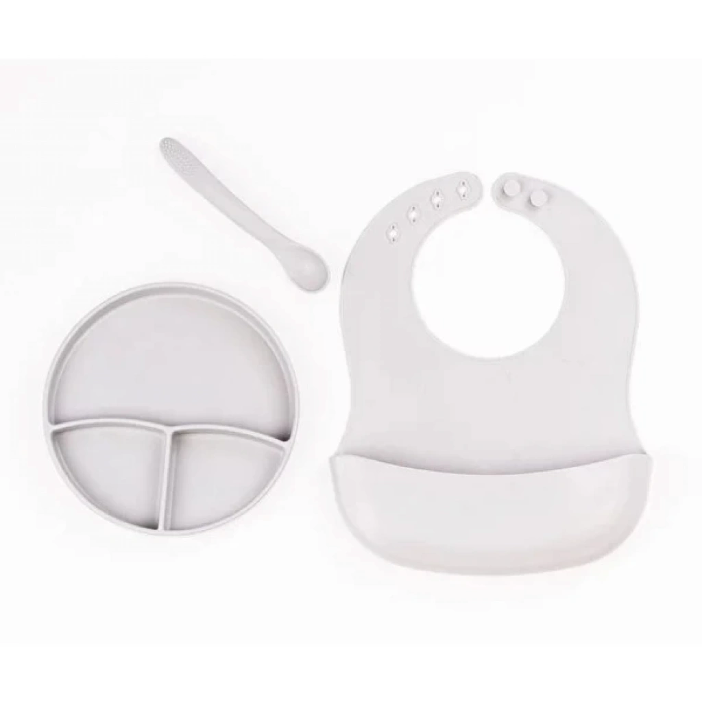 ÇOK SATAN Gri 3’lü Silikon Yemek Seti – Önlük + Diş Kaşıyıcılı Kaşık + Vakumlu Tabak
