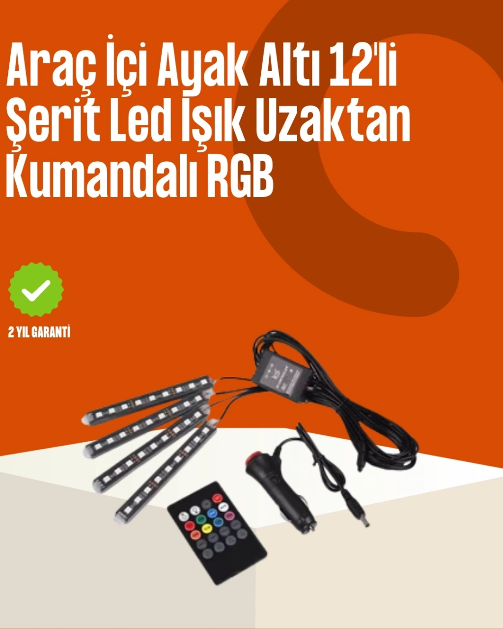 Aracınızın iç kısmında dikkat çekici bir görünüm oluşturmak için tasarlanan bu LED sistem, şık ve etkili bir çözüm sunar. Paket içeriğinde, her biri 13 cm uzunluğunda, 12 LED boncuklu 4 ışık parçası bulunur. Toplamda 48 adet LED ile güçlü ve geniş açılı aydınlatma sağlar.Işıklar, kumanda yardımıyla kontrol edilir. 12 farklı sabit renk ve RGB geçiş efekti sayesinde istenilen ortam kolayca yaratılır. Açma-kapama fonksiyonu yine kumanda üzerinden pratik şekilde yapılabilir.Ürün, 12V araç çakmaklık çıkışına bağlanarak çalışır. Kablo gereksinimi düşüktür. Montajı, ürünle birlikte gelen çift taraflı yapışkan bant sayesinde hızlı ve kolaydır. Enerji tüketimi düşük olduğundan aküye yük bindirmez ve LED’lerin ömrü uzundur.