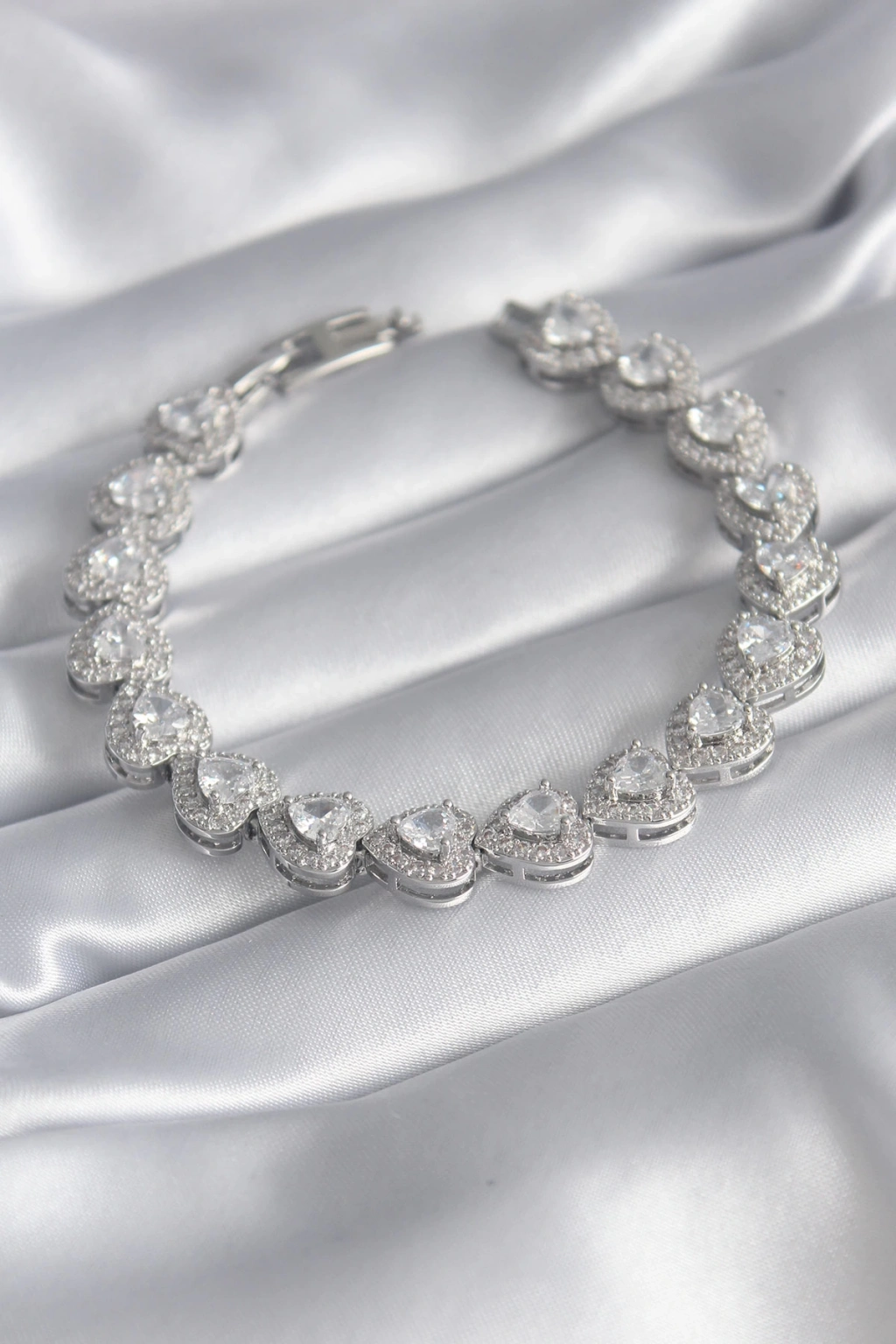 ÇOK SATAN Pirinç Gümüş Renk Zirkon Taşlı Kalp Model VIP Seri Kadın Bileklik