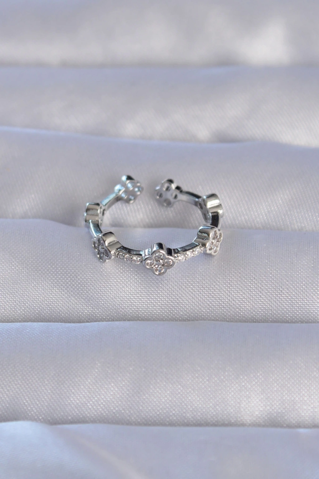 ÇOK SATAN Pirinç Gümüş Renk Zirkon Taşlı Yonca Model Ayarlanabilir Yüzük