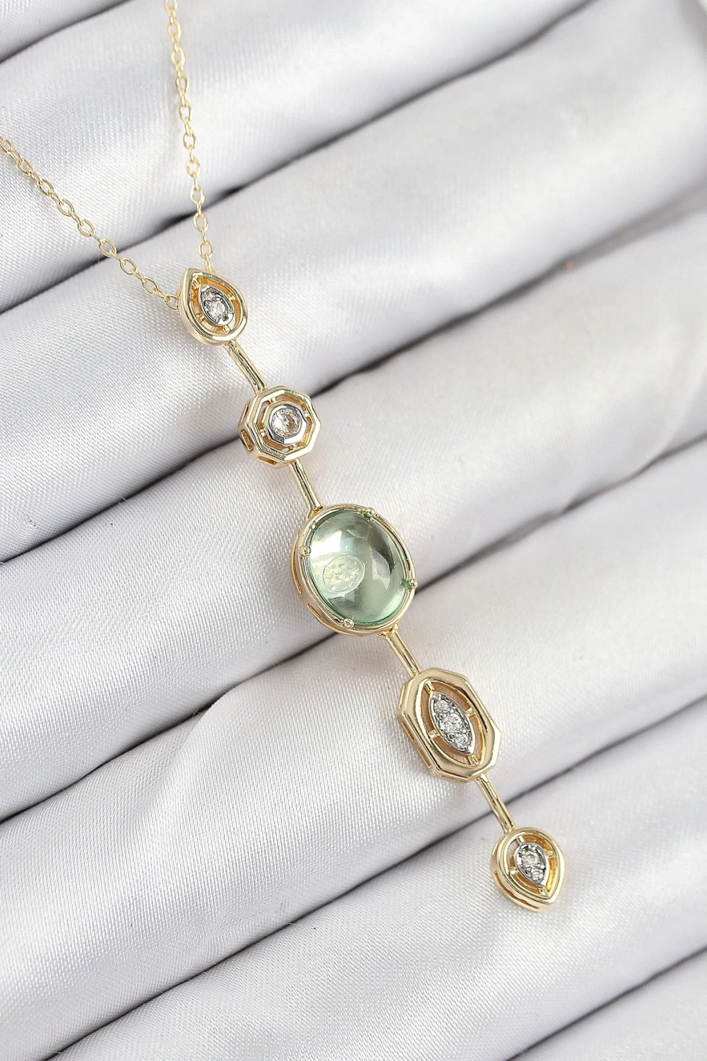 • Pirinç Zincir Yeşil Gold Renk Zirkon Taşlı Y Kolye