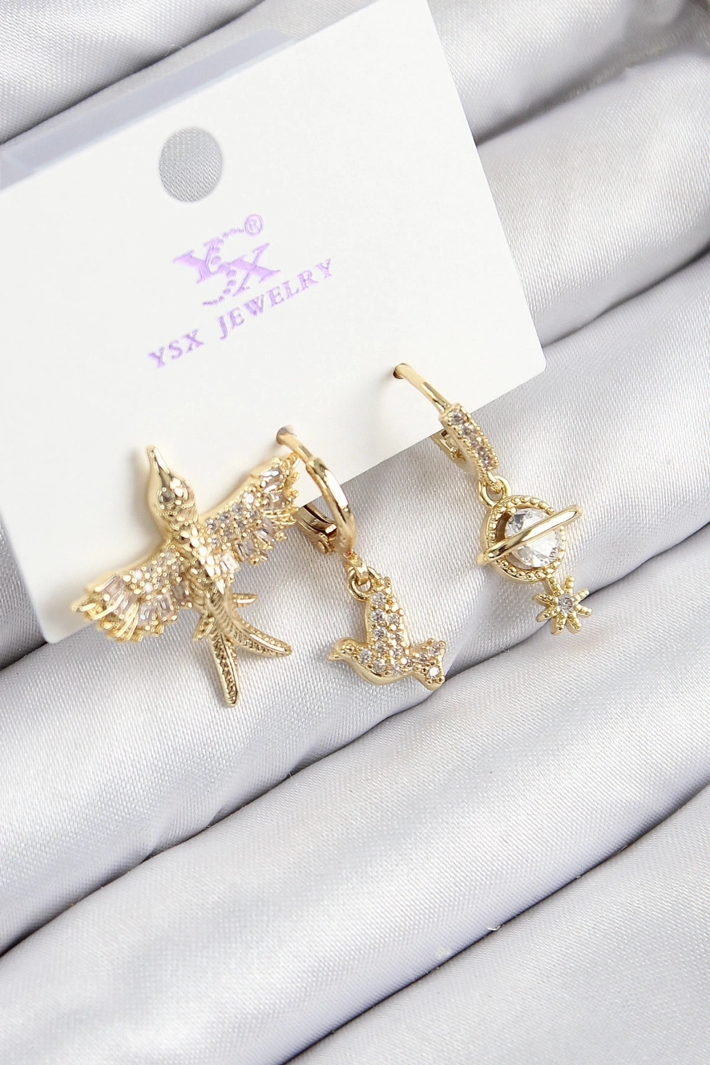 ÇOK SATAN Pirinç Zirkon Taşlı 3'lü Kuş Model Gold Renk Kadın Küpe