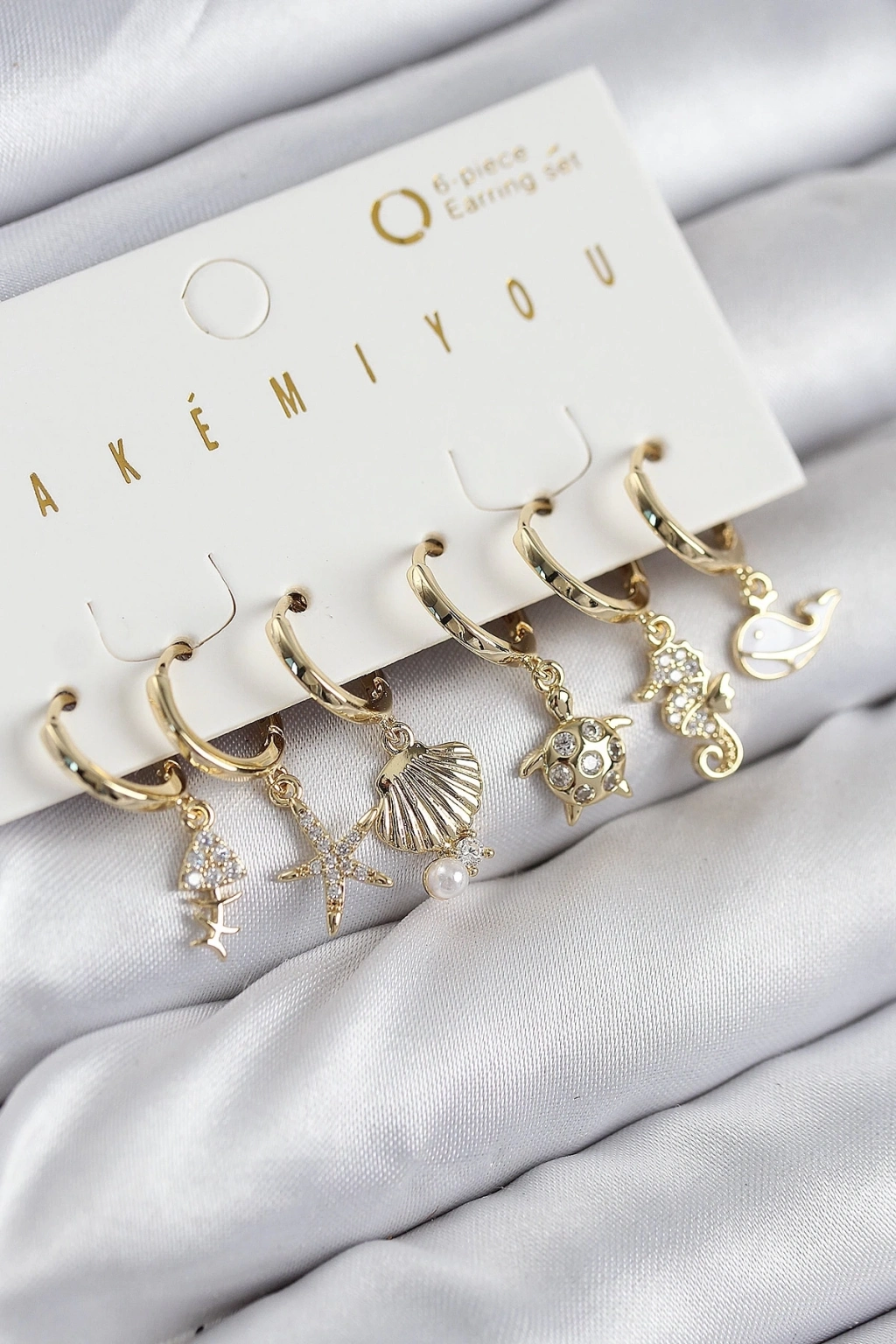 ÇOK SATAN Pirinç Zirkon Taşlı İstiridye Balina Ve Yıldız Gold Renk 6'lı Küpe Set