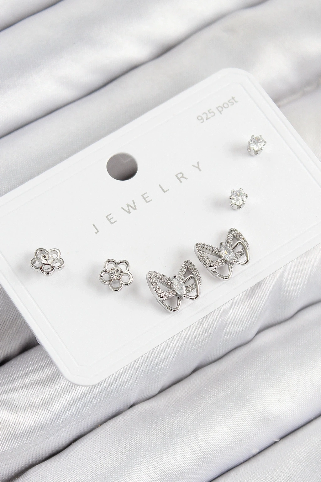 • Pirinç Zirkon Taşlı Kelebek Model Gümüş Renk 925 Ayar Gümüş Çivi Kadın Küpe Set