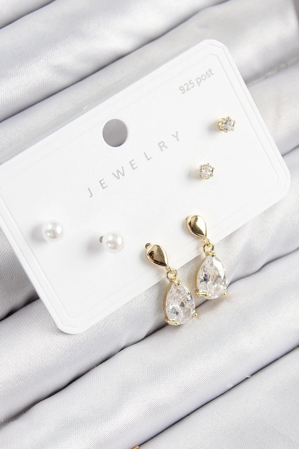 • Pirinç Zirkon Taşlı Sallantılı Damla Model Gold Renk 925 Ayar Gümüş Çivi Kadın Küpe Set