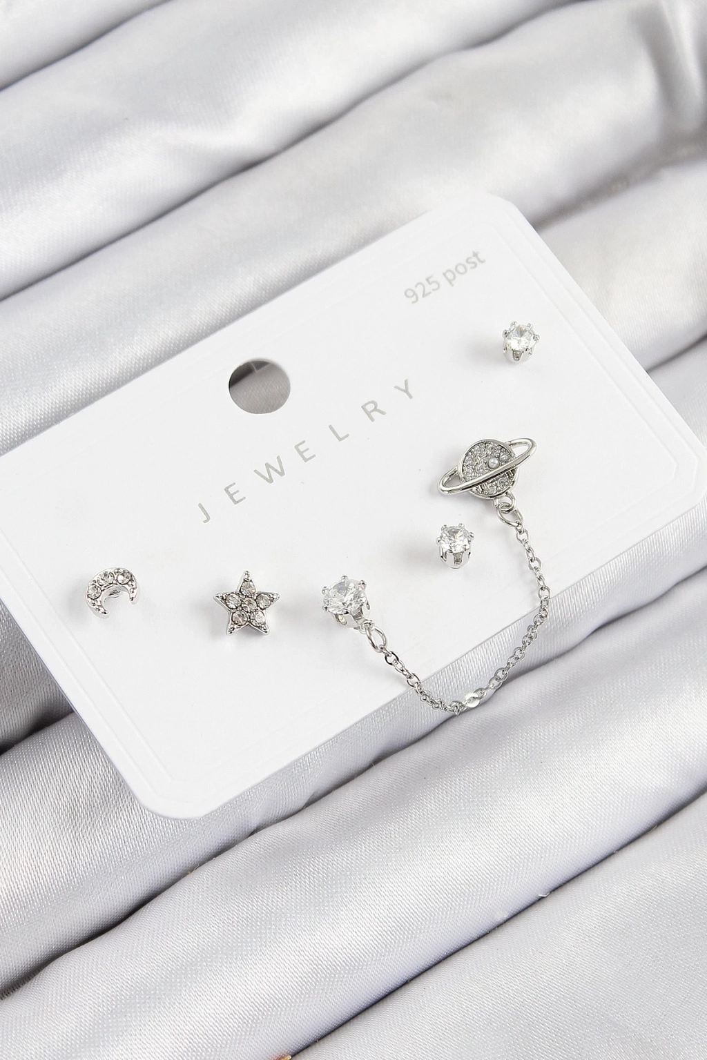 ÇOK SATAN Pirinç Zirkon Taşlı Yıldız Ve Gezegen Model Gümüş Renk 925 Ayar Gümüş Çivi Kadın Küpe Set