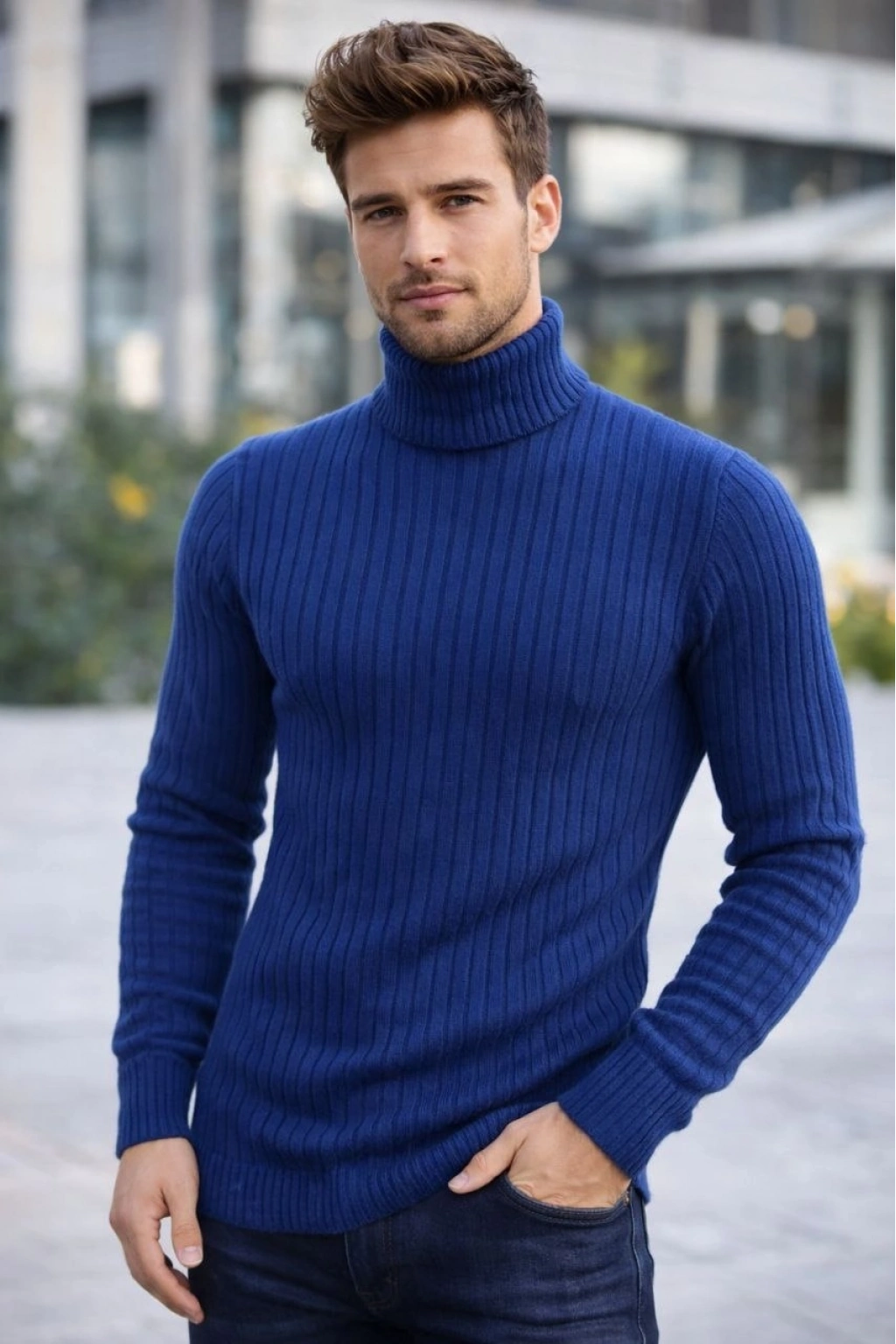 Balıkcı Yaka Bağazlı Triko Kazak Pamuklu Kalın Fitilli Dokuma, Regular Fit Uzun Kollu Kışlık Model - İndigo
