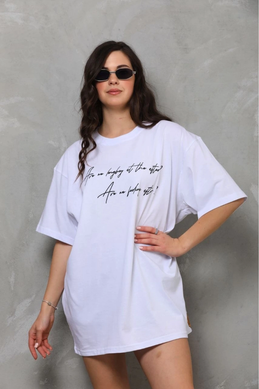 Bisiklet Yaka Baskılı Oversize T-Shirt - Beyaz
