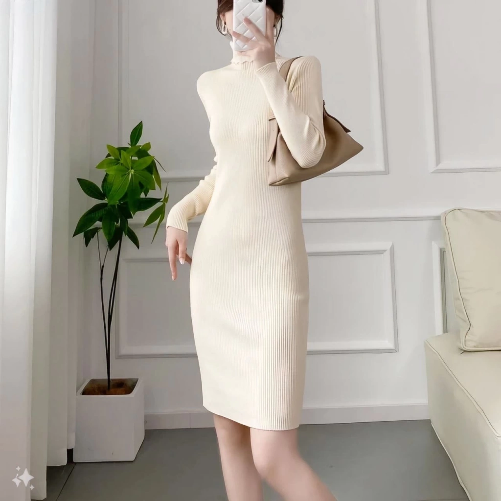 Boğazlı Uzun Fitilli Triko Dokuma Elbise - Beyaz