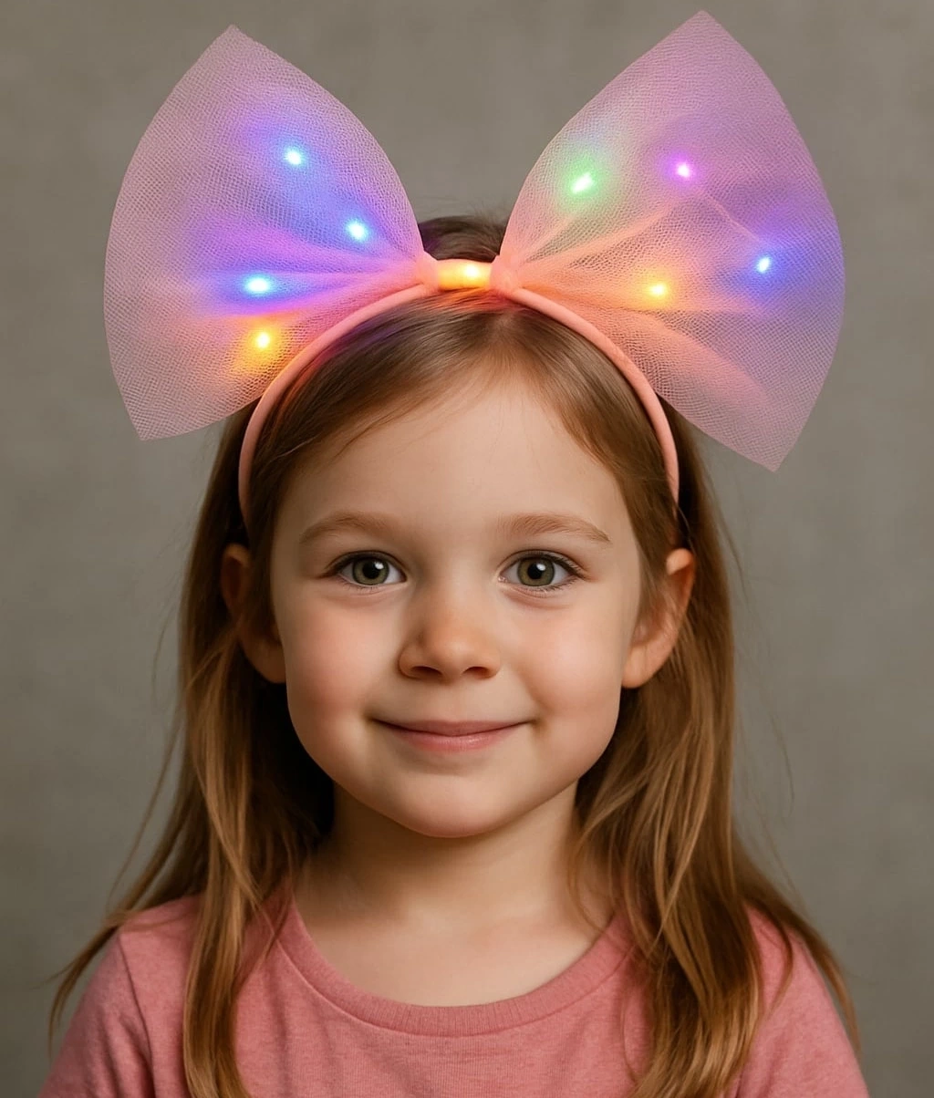 Bu güzel tül parti tacı, her partiye veya özel vesileye renk katmak için mükemmeldir. Tacın pembe fiyonk şekli ve rengarenk LED ışıkları onu göz alıcı bir aksesuar haline getirir. 25x25 cm boyutlarındadır ve çoğu yetişkin ve çocuğa uygundur.