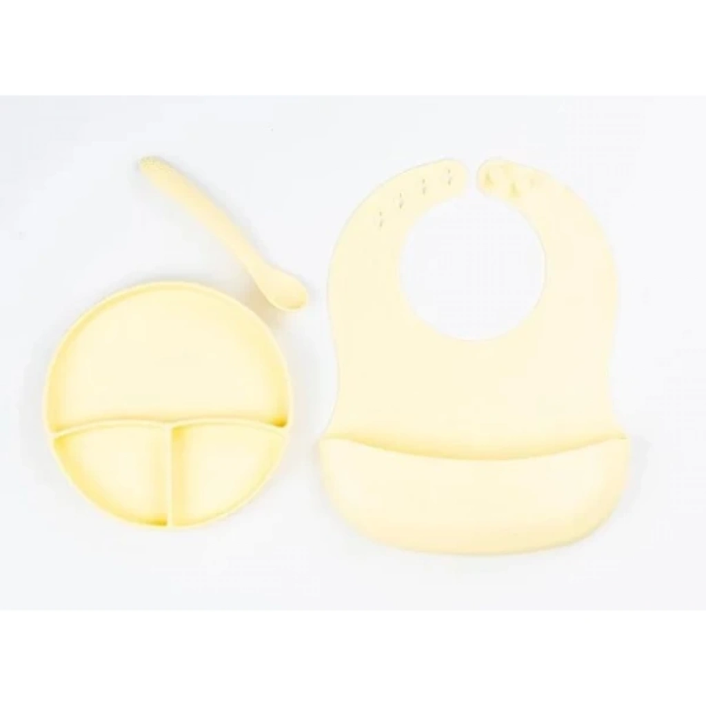 ÇOK SATAN Sarı 3’lü Silikon Yemek Seti – Önlük + Diş Kaşıyıcılı Kaşık + Vakumlu Tabak