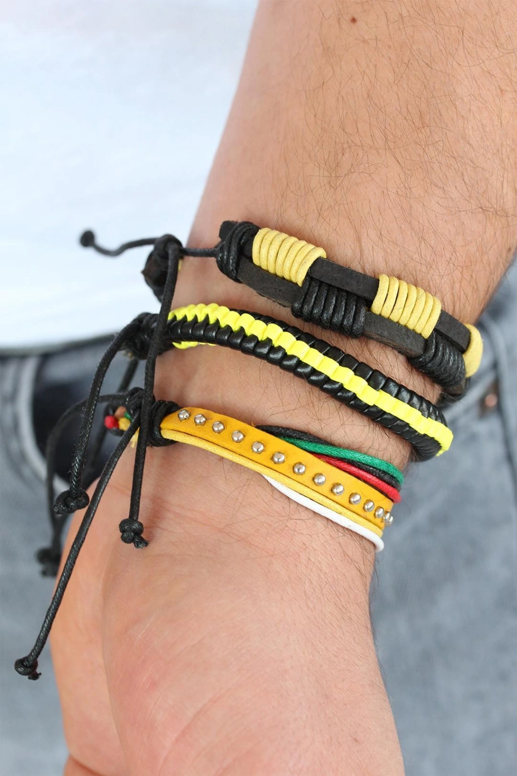 Kombinlerinizi Sarı Renk Zımbalı Deri Erkek Bileklik Kombini ile detaylandırın.