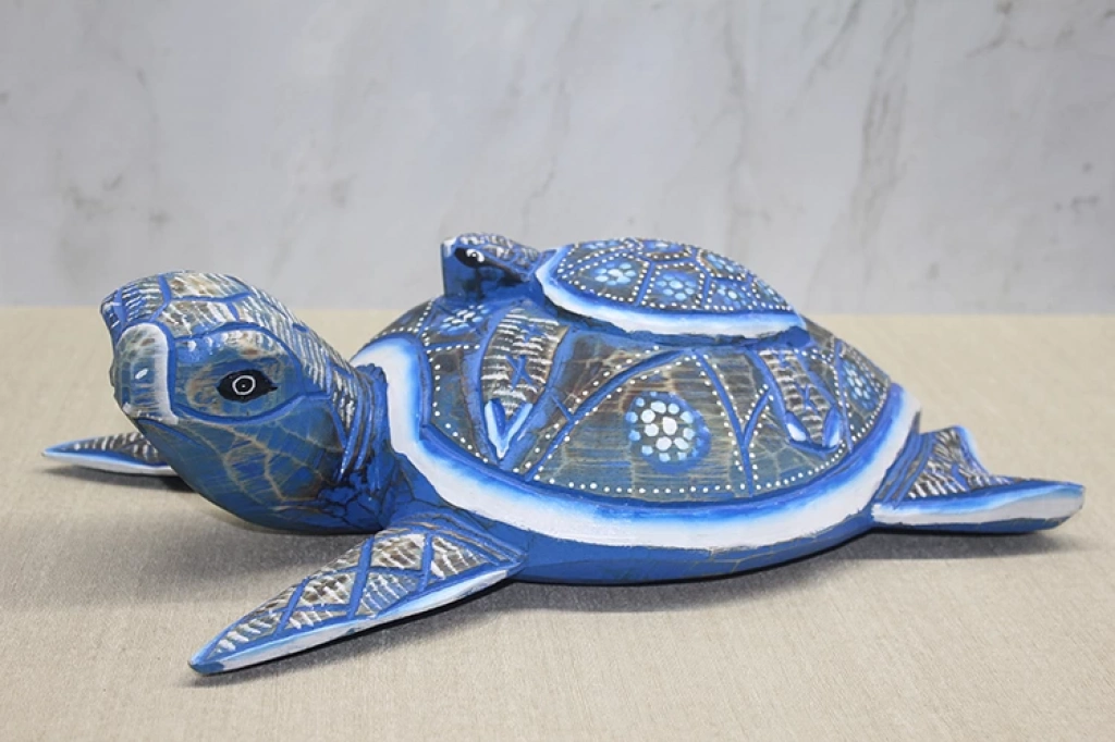 TEKLİ AHŞAP KAPLUMBAĞAÜrün ÖzellikleriTekli Ahşap Kaplumbağa, el işçiliği ile üretilmiş ve geleneksel tarzda boyanmıştır. 40 cm boyutunda olan bu dekoratif figür, mekanınıza doğallık ve sıcaklık katacak şekilde tasarlanmıştır. Ahşap malzeme kullanılarak yapılan bu kaplumbağa figürü, dayanıklı ve estetik bir dekorasyon öğesidir. Mavi renk tonları ve ince detaylarla işlenmiş kabuğu, zarif bir görünüm sunar. Bu ürün, özellikle doğal ve organik dekorasyonları sevenler için idealdir.Paket İçeriği1 Adet Ahşap Kaplumbağa Figürü