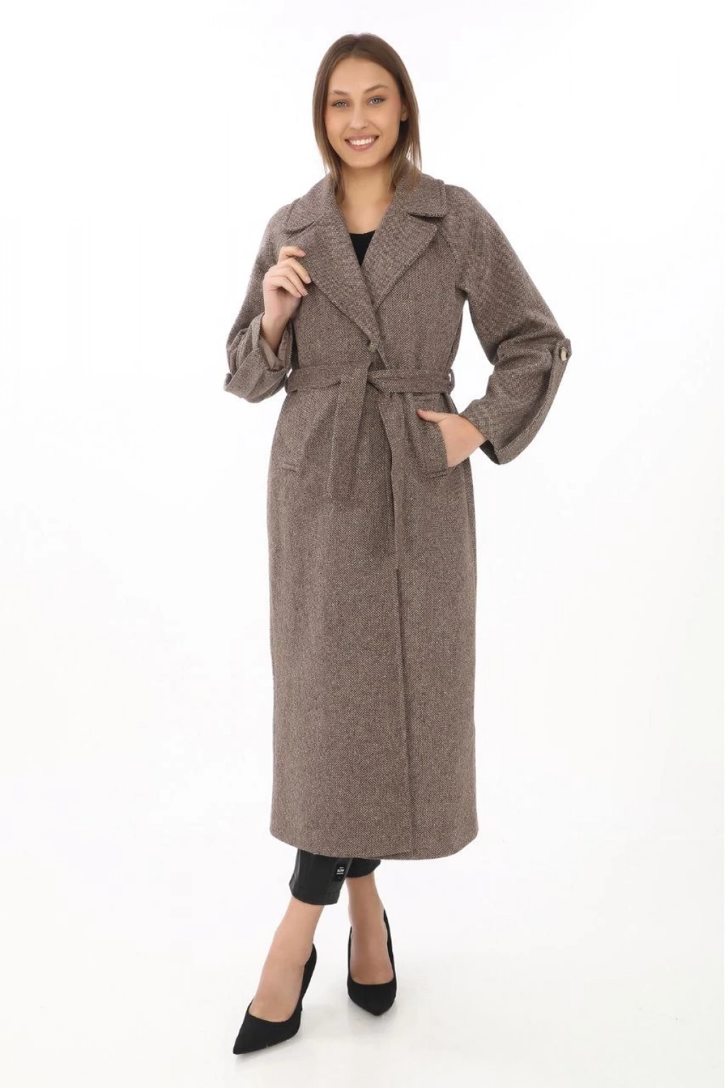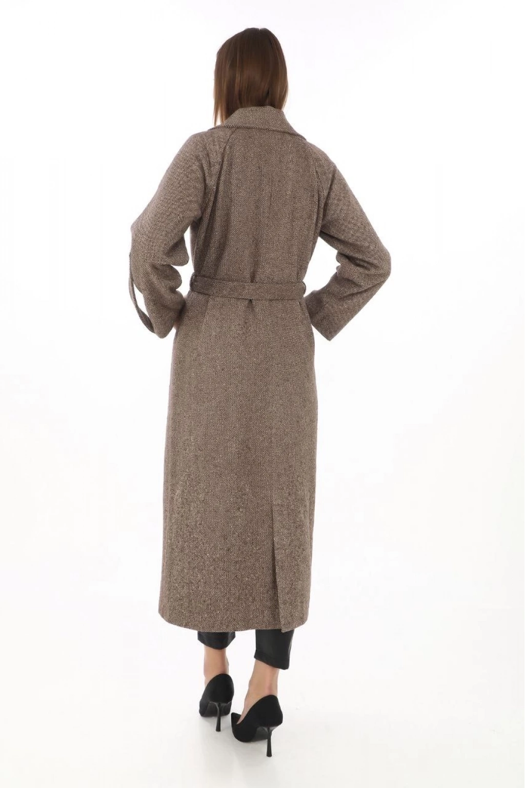 Uzun Kaşe Kaban – Yünlü Dokuma Kaşmir Kumaş, Kruvaze Yaka, Kuşaklı Astarlı Tesettür Uyumlu Şık Kışlık Siyah Model- Vizon