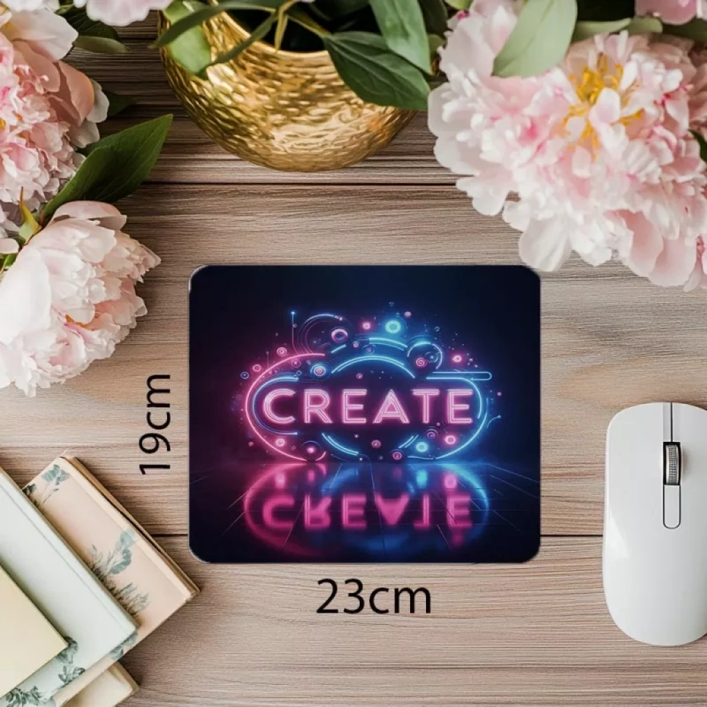 “Create” yazısını parlak neon ışıklarla öne çıkaran bu mousepad, modern ve ilham verici bir tasarım deneyimi sağlar.