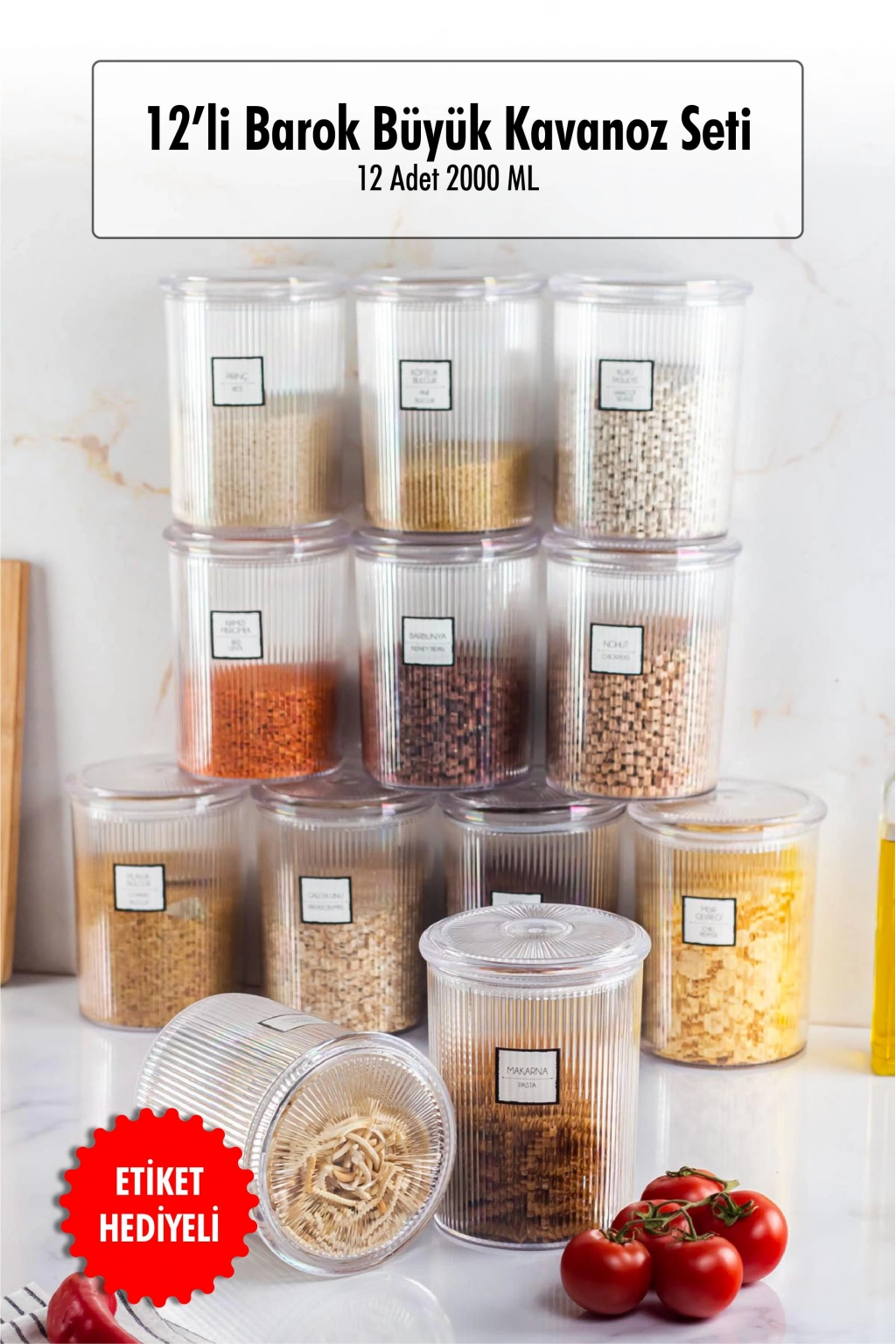 12'li Barok Yuvarlak Büyük Kavanoz Seti & Saklama Kabı & Erzak Kabı (12*2000 ML)
