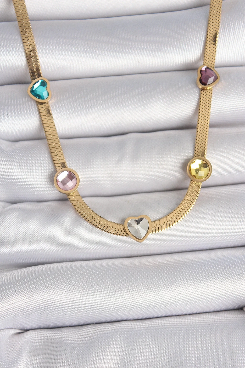 316L Çelik Gold Renk İtalyan Zincir Renkli Zirkon Taşlı Kalp Figür Kadın Kolye