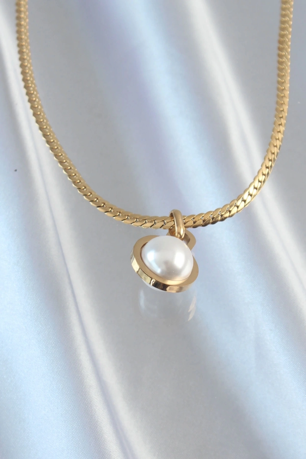 316L Çelik Gold Renk Yassı Zincir İnci Taşlı Kolye