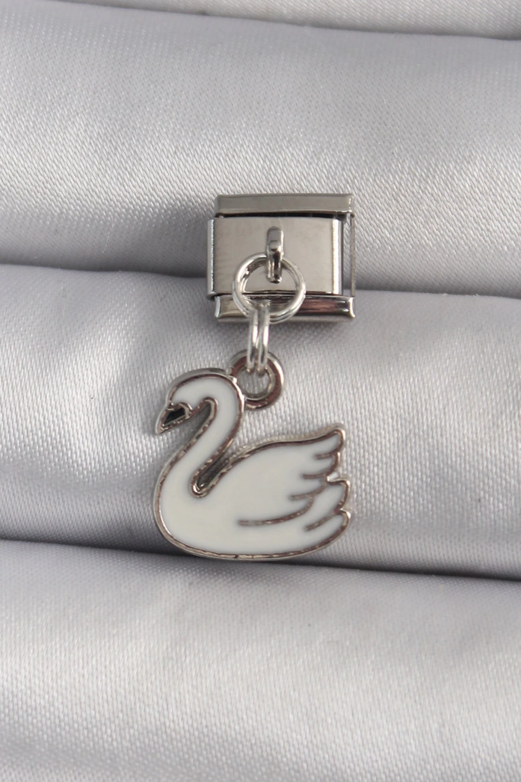 316L Çelik Gümüş Renk Sallantı Beyaz Kuğu Model Nomination Charm