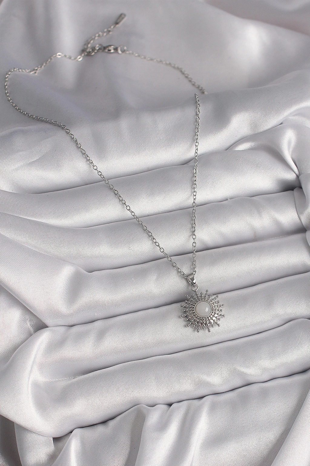 316L Çelik Gümüş Renk Zincir Beyaz Mineli Güneş Model Kadın Kolye