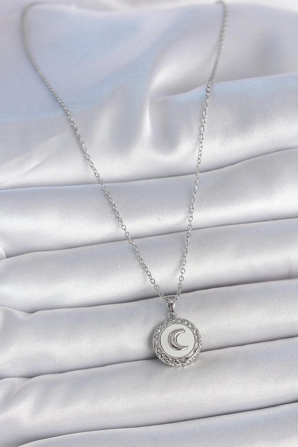 316L Çelik Gümüş Renk Zincir Beyaz Mineli Hilal İşlemeli Madalyon Model Kadın Kolye