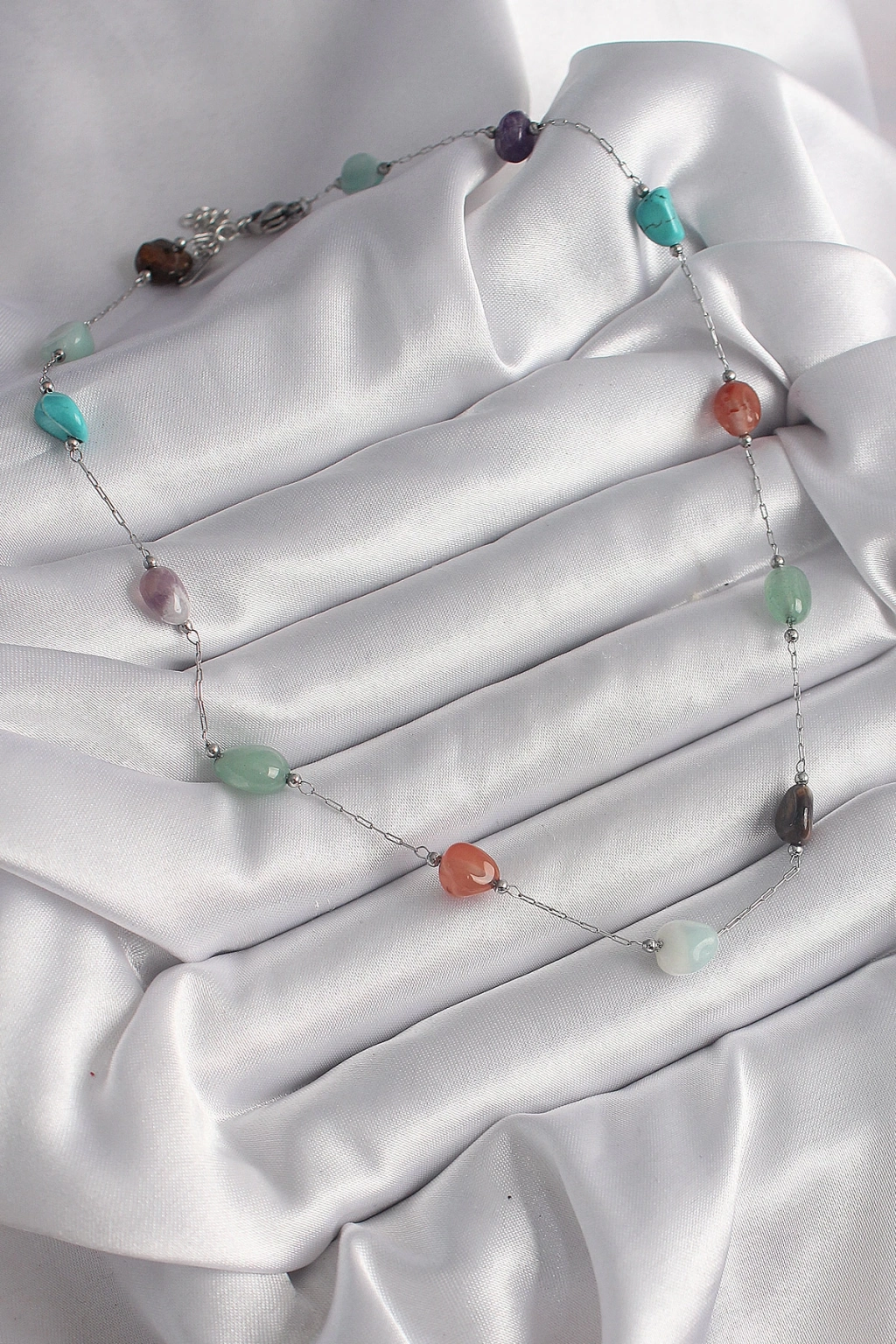 316L Çelik Gümüş Renk Zincir Renkli Doğaltaş Model Kadın Kolye