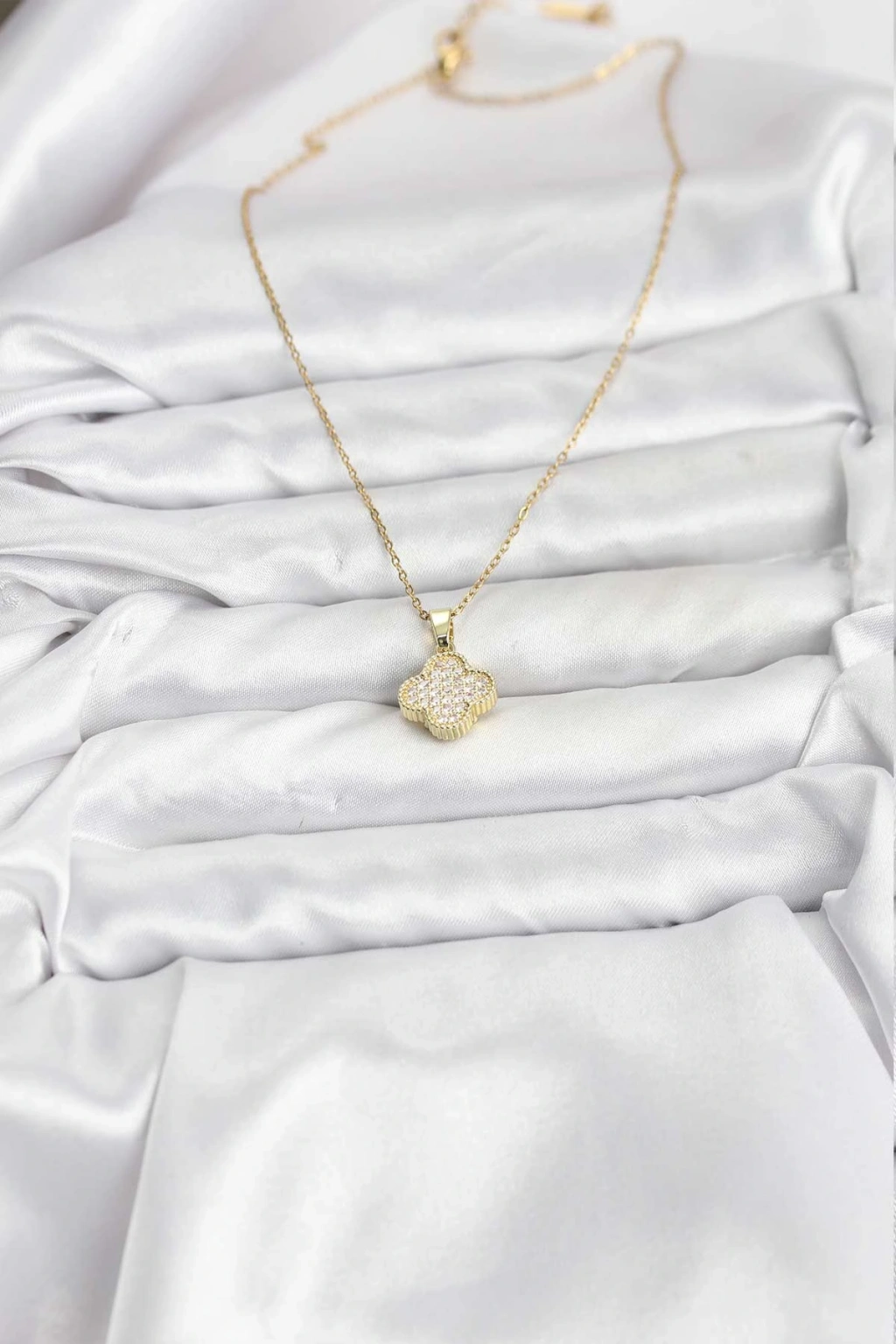 316L Çelik Zincir Gold Renk Zirkon Taşlı Yonca Model Kadın Kolye