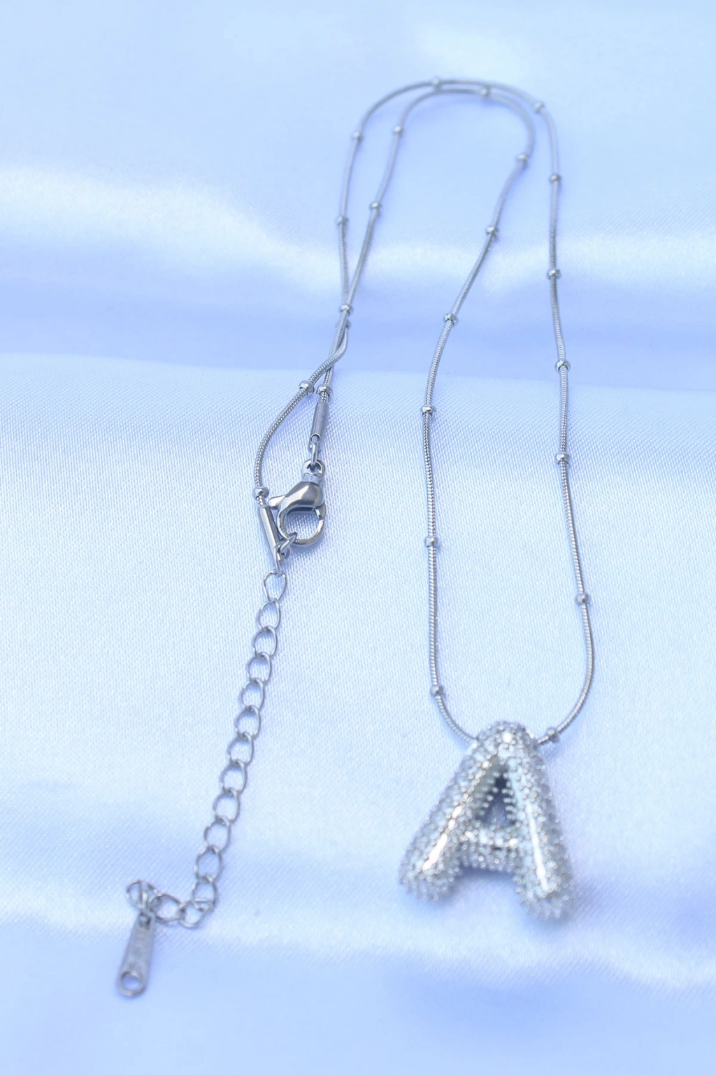 316L Çelik Zincirli Zirkon Taşlı A Harfli Gümüş Renk Bubble Kolye