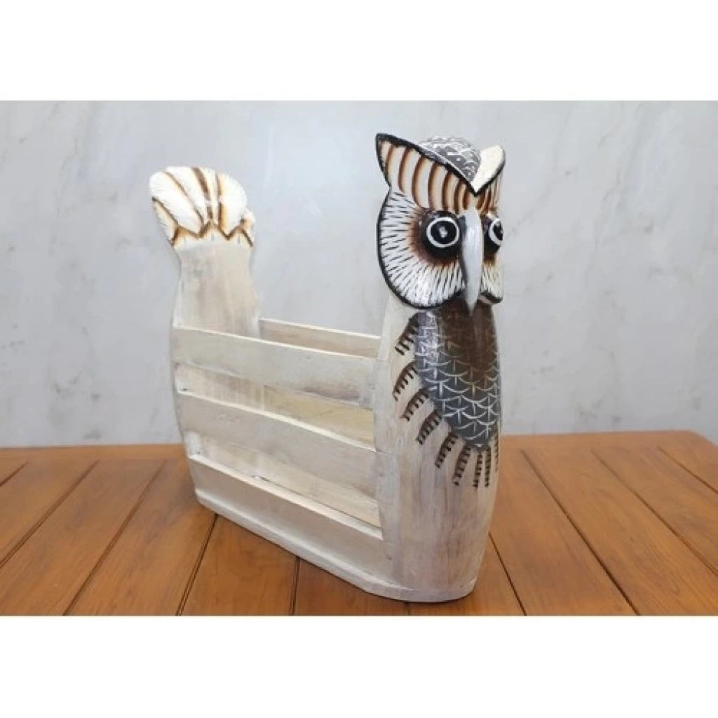AHŞAP BAYKUŞ GAZETELİKÜrün ÖzellikleriDoğal ahşaptan üretilen baykuş figürlü gazetelik, 33x43 cm boyutundadır. Estetik ve dekoratif tasarımıyla gazete, dergi ve kitaplarınızı düzenli bir şekilde saklamanızı sağlar. El işçiliğiyle özenle hazırlanmış olan bu ürün, ev ve ofis dekorasyonuna şık bir dokunuş katar. Ahşap dokusu sayesinde uzun ömürlü ve dayanıklı bir kullanım sunar.Paket İçeriği1 adet ahşap baykuş gazetelik.