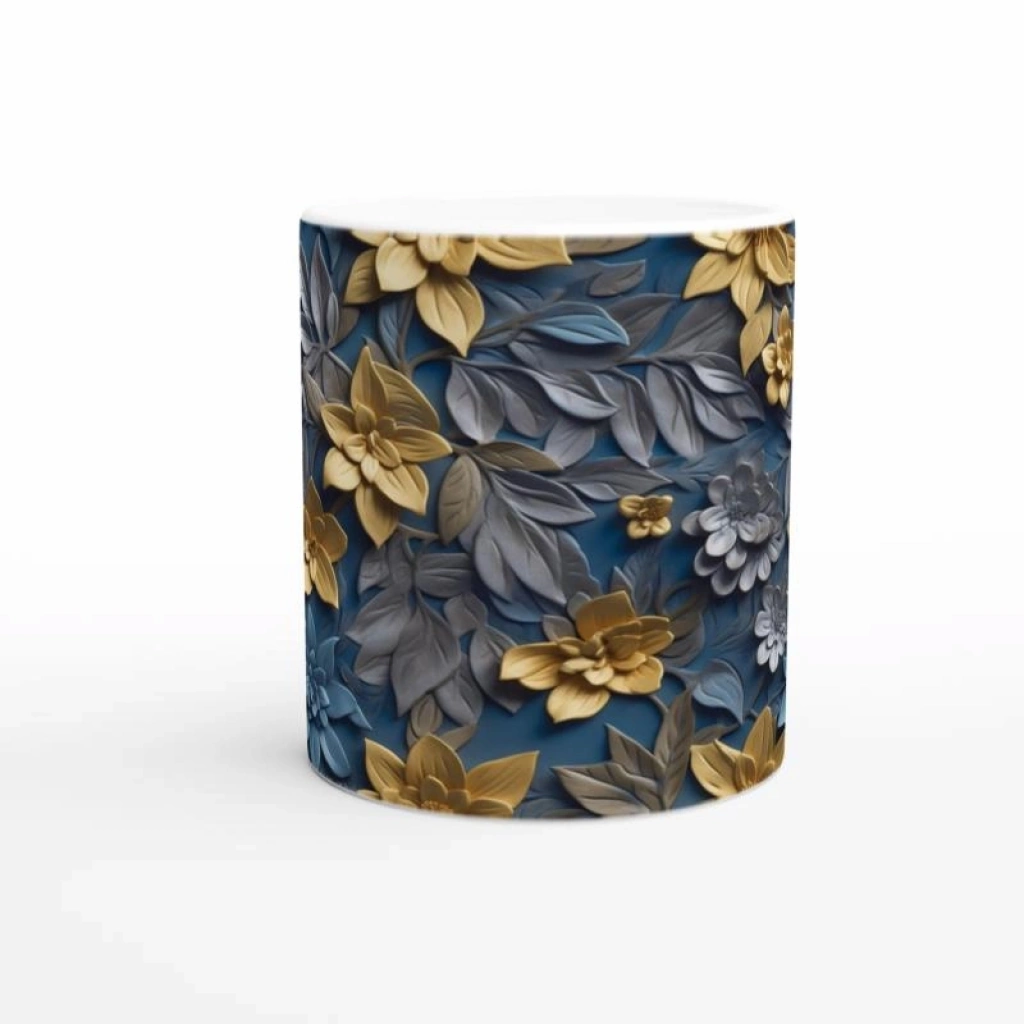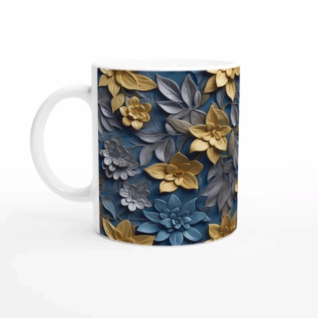Altın Sarısı ve Mavi Rölyef Çiçek Desenli Kupa Bardak