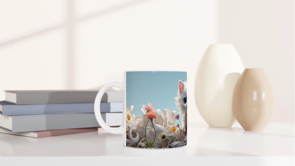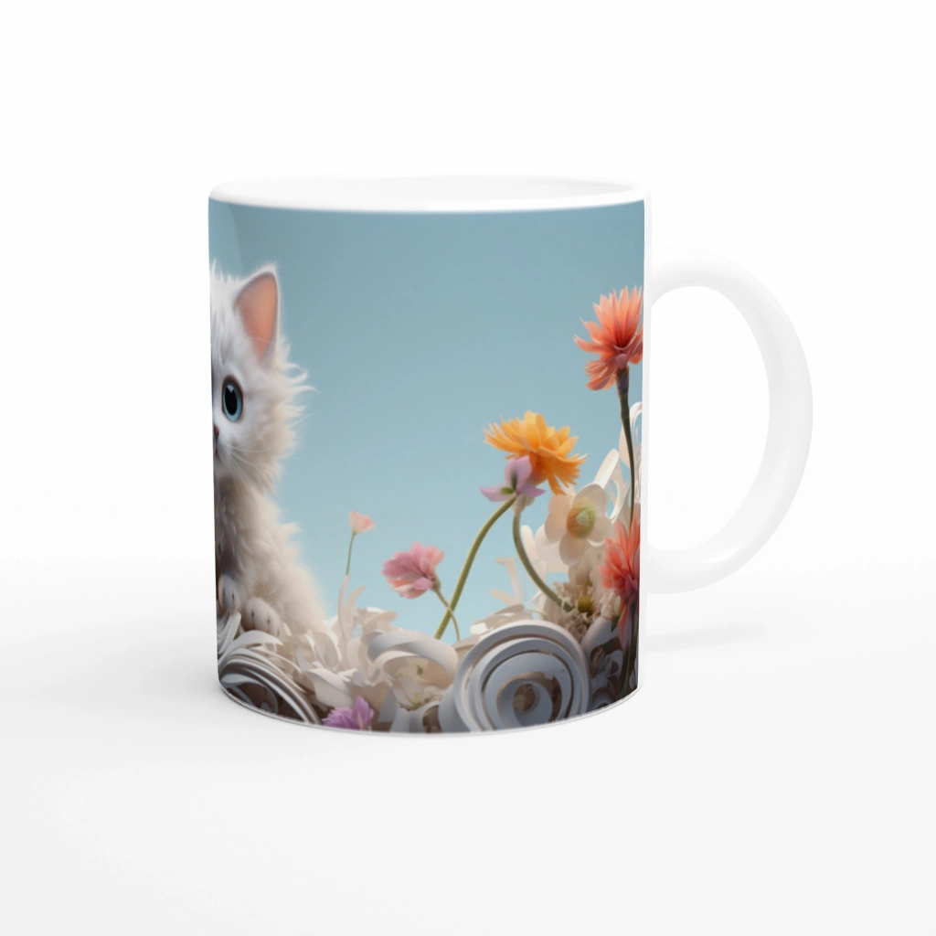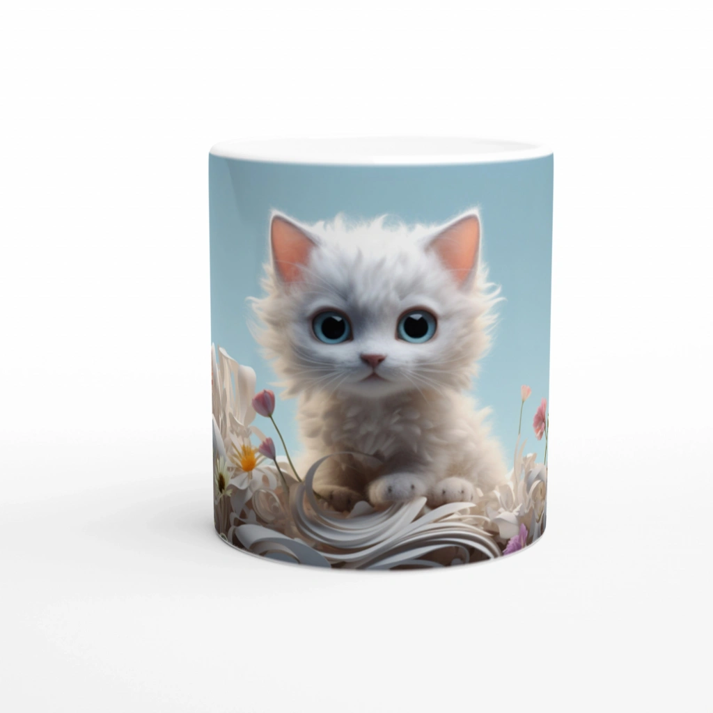 Bahçedeki Masum Bakışlı Yavru Kedi Baskılı Kupa Bardak, pastel tonlarda illüstrasyon çiçekler ve masum mavi gözleriyle güne yumuşak bir başlangıç yapmanızı sağlar. Hayvan severlere ve narin tasarımları sevenlere özel bir hediye seçeneği.