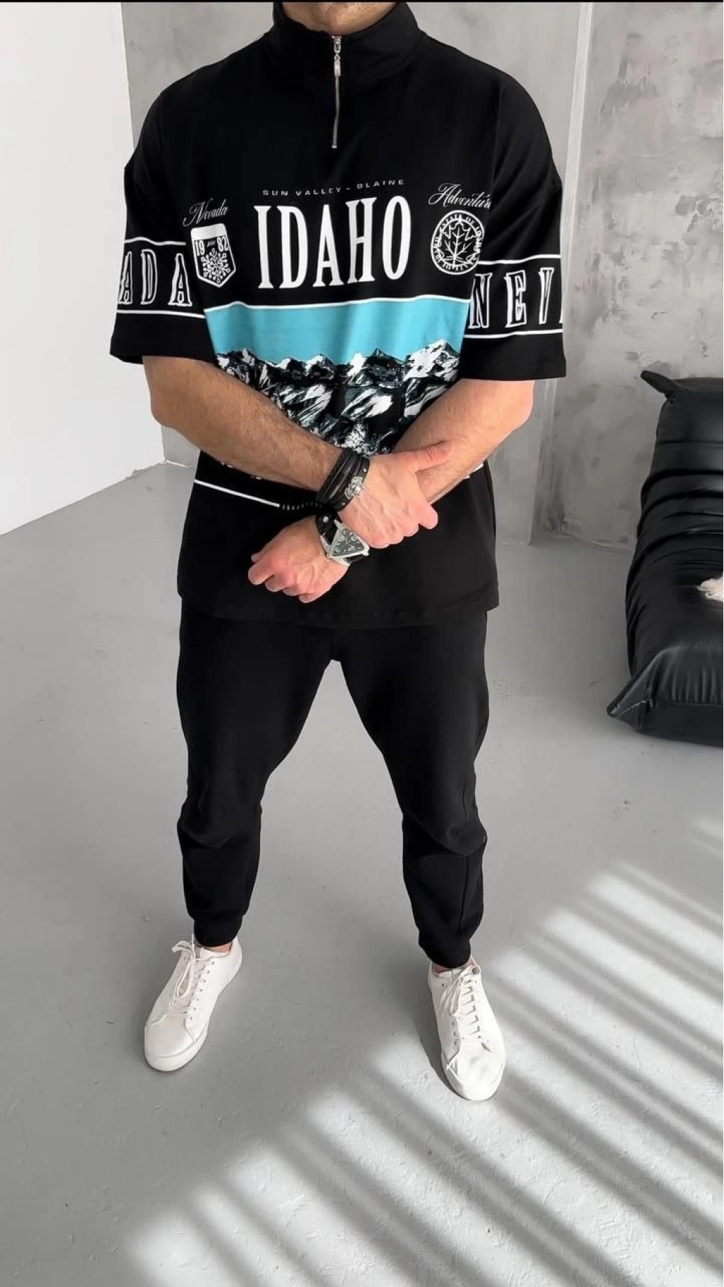 Baskılı Yarım Fermuarlı T-Shirt - Siyah -