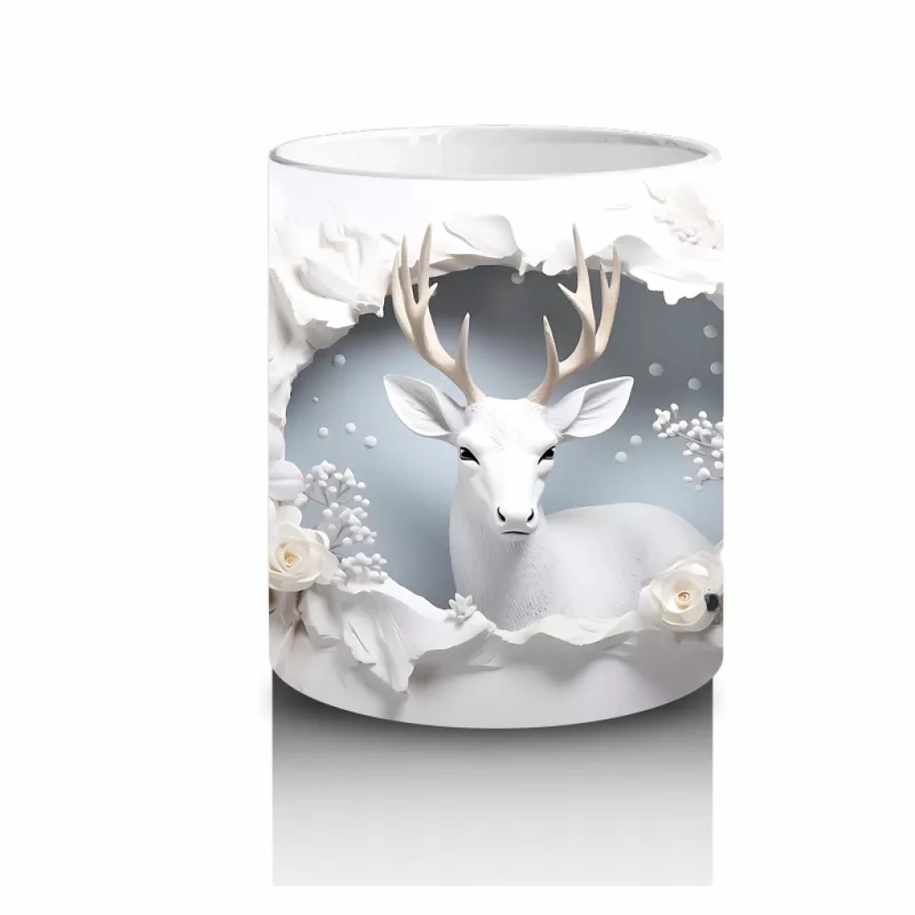 Zarif boynuzları ve duruşuyla dikkat çeken asil geyik, beyaz çiçekler arasında huzur veren bir görüntü sunuyor. Doğa temalı, estetik yönü güçlü bir kupa arayanlar için etkileyici bir tercih.