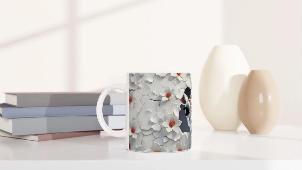 Beyaz Çiçekler Arasında Zürafa Temalı Baskılı Kupa Bardak, çiçekler arasından gülümseyen minik zürafa figürüyle sıcak bir atmosfer yaratıyor. Bu eğlenceli ve zarif tasarım, içecek keyfinizi bambaşka bir seviyeye taşıyacak.