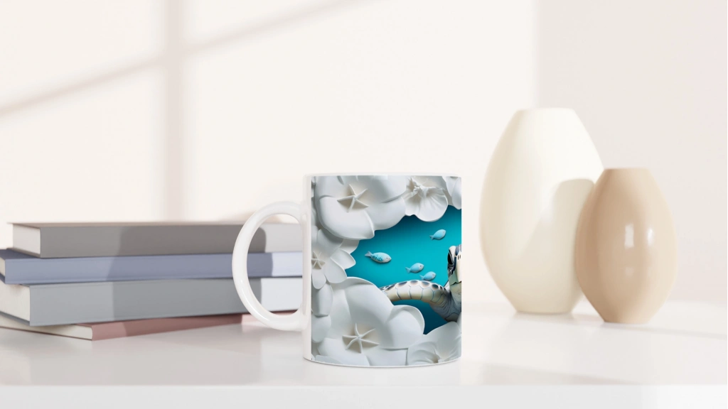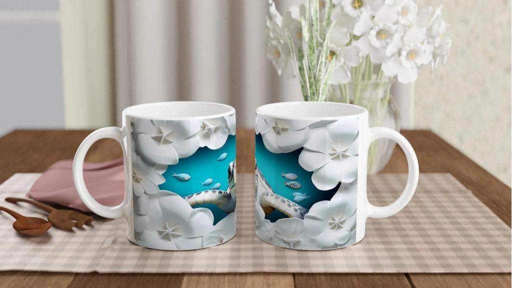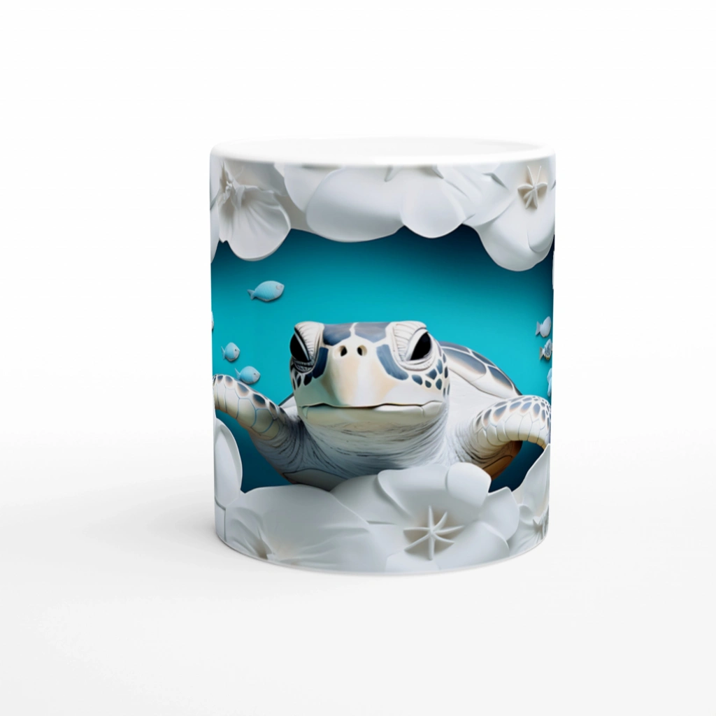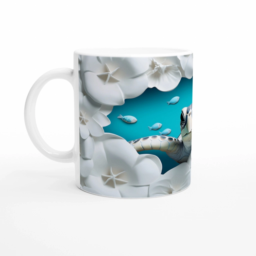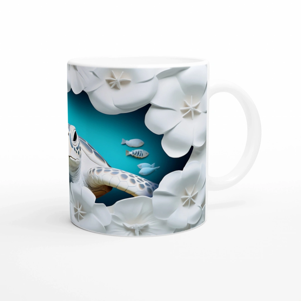 Beyaz çiçekler ve mavi balıklarla çevrili sevimli deniz kaplumbağası tasarımlı bu özel kupa bardak, deniz tutkunlarının favorisi olmaya aday!