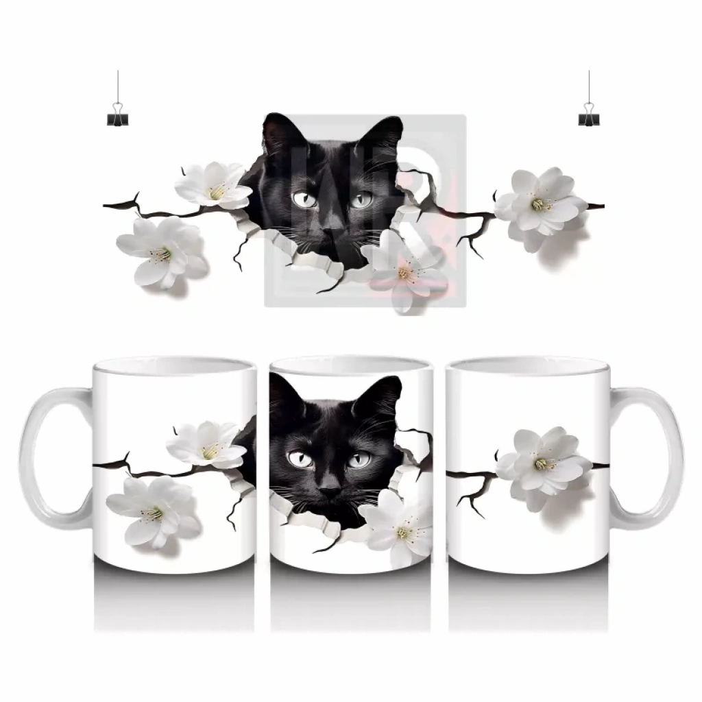 Beyaz Çiçeklerle Kaplı Siyah Kedi – Baskılı Kahve Kupası