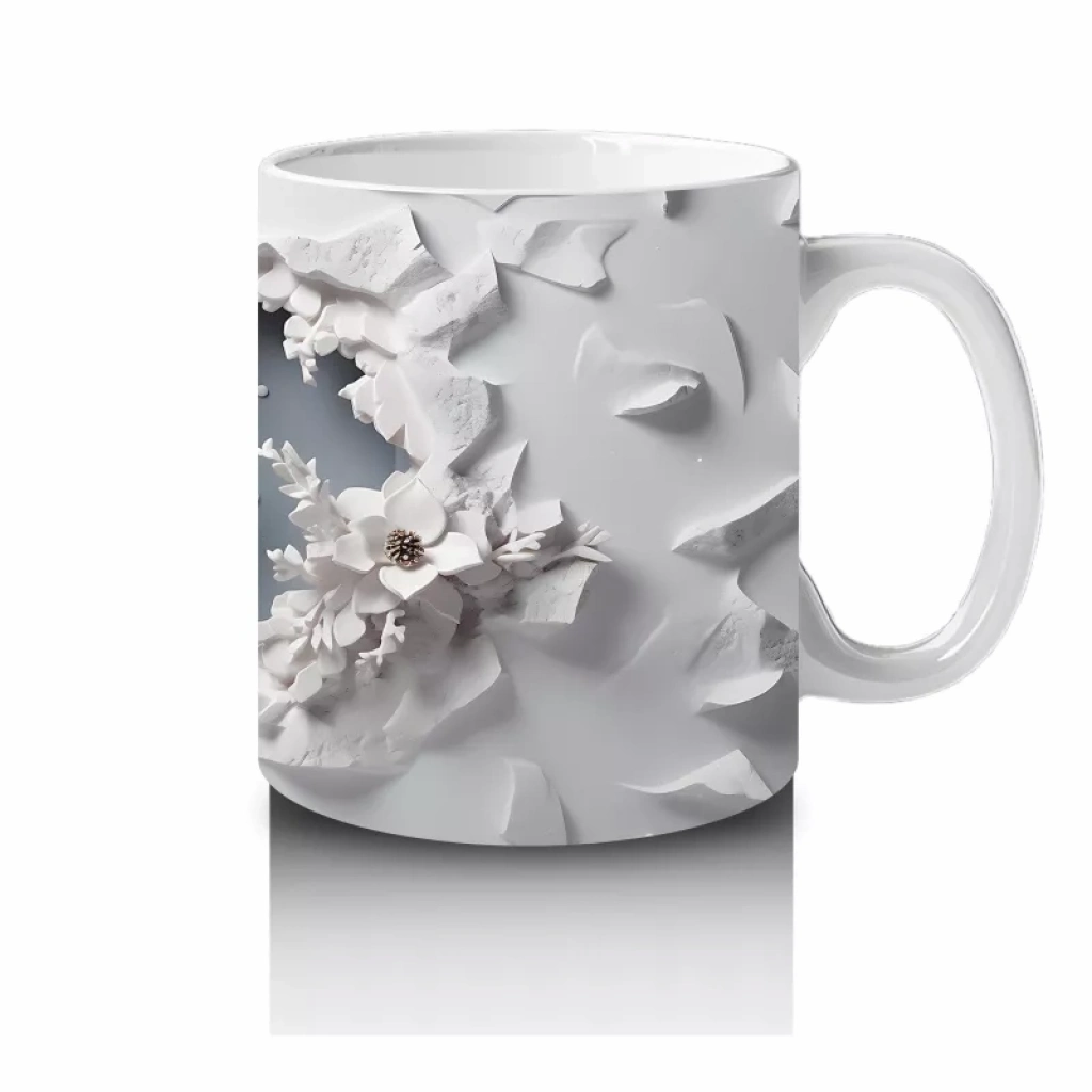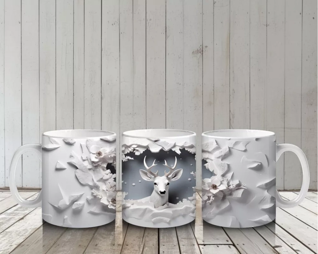 Beyaz Çiçeklerle Süslenmiş Çatlak Zeminden Bakan Geyik – Baskılı Kahve Kupası