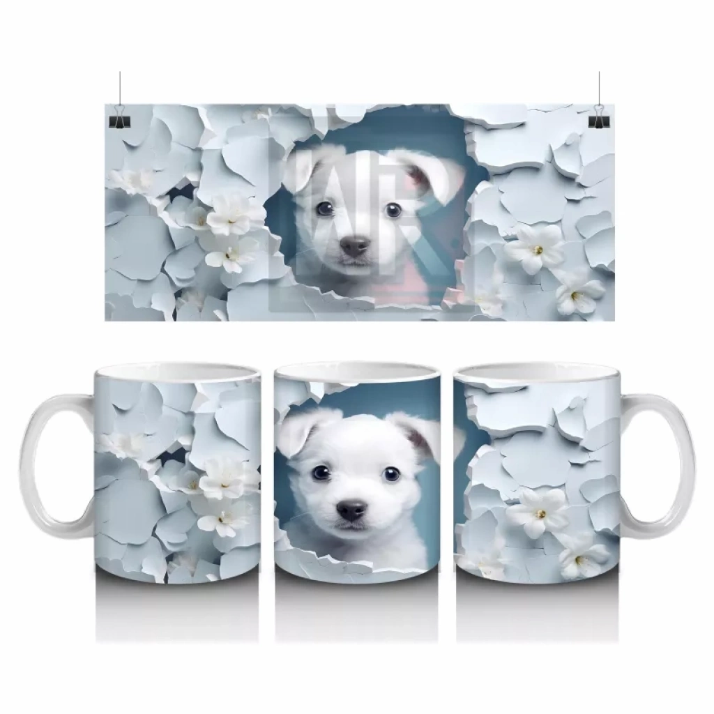 Beyaz Çiçekli Duvarı Delen Tatlı Yavru Köpek Kupa