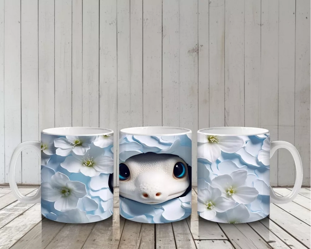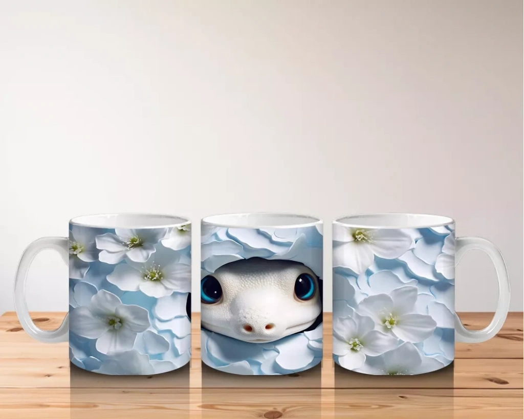 Beyaz çiçeklerin arasında parlayan mavi gözleriyle öne çıkan bu yavru, saf ve büyüleyici bir ifade sunuyor. Yumuşak tonları ve zarif dokunuşları sevenler için huzur dolu bir kupa tasarımı.