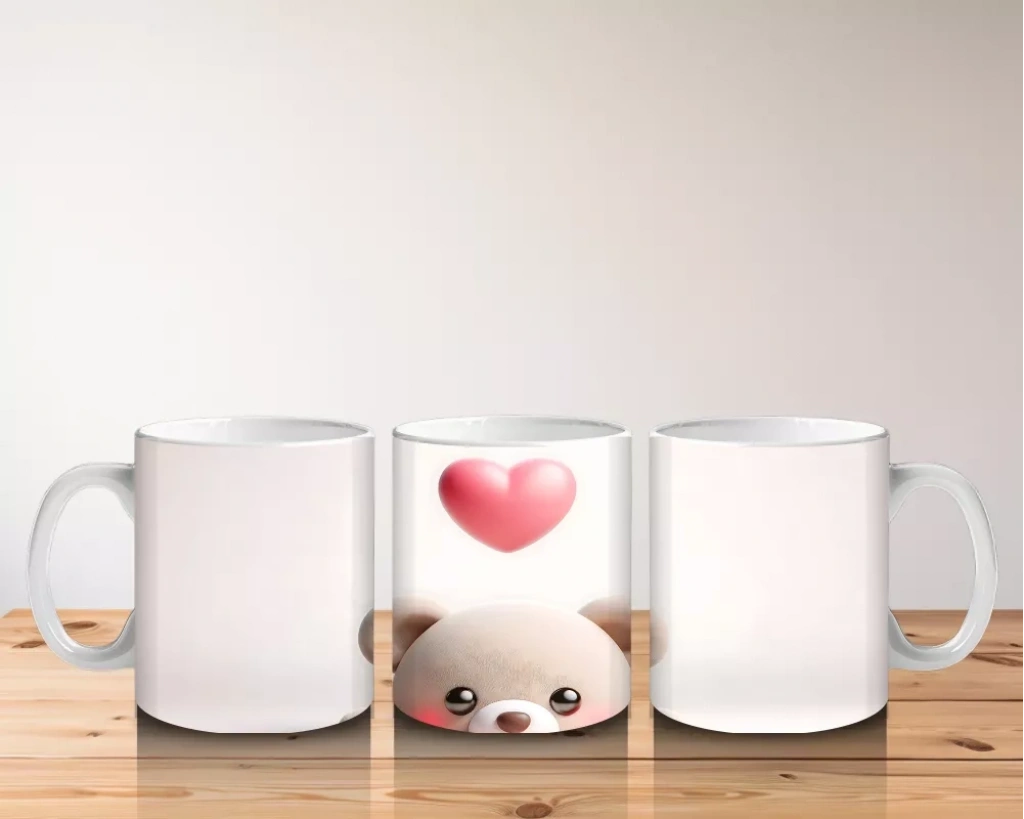 Beyaz sade zemin üzerinde gözlük takan ayıcık, şirin ve modern bir görünüm sunuyor. Sade ama etkileyici detayları sevenler için ideal bir kupa tasarımı.