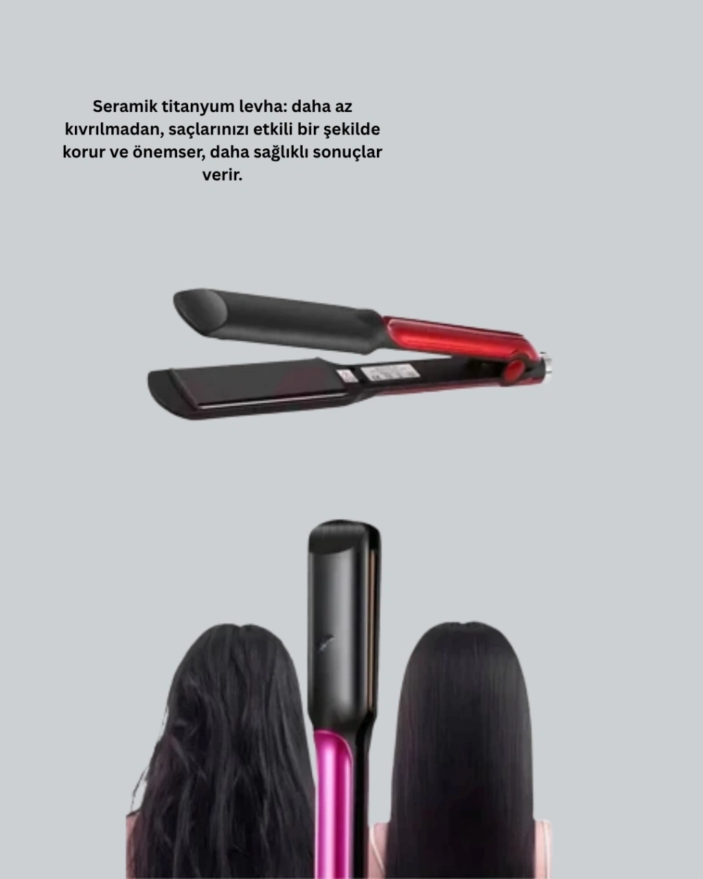 Günlük hayatta zamandan tasarruf ederek saçlarını kusursuz ve sağlıklı bir şekilde şekillendirmek isteyen herkes için özel olarak tasarlanan bu profesyonel saç düzleştirici, şıklığı ve performansı bir araya getiriyor. Hem evde kullanıma hem de seyahat esnasında taşımaya uygun kompakt tasarımı, hızlı ısınma özelliği, saç yapısına zarar vermeyen teknolojisi ve çok yönlü kullanım imkanıyla öne çıkan bu düzleştirici, kullanıcıların farklı ihtiyaçlarını karşılamak için donatıldı.Ayarlanabilir Isı Seviyesi – Her Saç Tipi İçin UygunCihazın 160°C, 180°C, 200°C ve 220°C olmak üzere dört farklı ısı ayarı bulunur. Bu özellik sayesinde kullanıcılar saç yapısına en uygun sıcaklık seviyesini seçebilir. İnce telli saçlar düşük ısıda kolayca şekillenirken, kalın ve kabarık saçlar daha yüksek sıcaklıkla etkili şekilde düzleştirilebilir. Isı ayarı, saçların zarar görmesini önleyerek sağlıklı şekillendirme sağlar.Titanyum Plaka Teknolojisi ile Hızlı IsınmaDüzleştirici, titanyum malzemeden üretilmiş yüksek ısı iletkenliğine sahip plakalarla donatılmıştır. Bu plakalar sayesinde cihaz yalnızca 2 dakika içinde kullanıma hazır hale gelir. Titanyum yüzey, ısıyı eşit şekilde dağıtarak saçın her telinin dengeli bir biçimde şekillenmesini sağlar. Aynı zamanda saçta yanma, kırılma ve kuruma gibi istenmeyen etkileri minimuma indirir.Yuvarlatılmış Kenarlarla Dalga ve Hacim VermeYalnızca düzleştirme yapmakla kalmayan bu cihaz, yuvarlatılmış kenar tasarımı sayesinde saçlara dalga verme veya uçlara hacim kazandırma işlemlerinde de rahatlıkla kullanılabilir. Böylece kullanıcılar tek bir cihazla birçok saç modeline ulaşabilir. Gündelik kullanımdan özel davetlere kadar her ortamda stilinizi hızlıca oluşturabilirsiniz.İyon Teknolojisi ile Parlak ve Elektriksiz SaçlarGelişmiş iyon teknolojisi, düzleştirici çalışırken saç telinin çevresine negatif iyonlar yayarak elektriklenme ve kabarma sorunlarını ortadan kaldırır. Saçlarınız şekil aldıktan sonra doğal bir parlaklığa ve pürüzsüz bir görünüme kavuşur. Bu teknoloji ayrıca saçın nem dengesini korur, daha yumuşak ve bakımlı bir doku oluşturur.Ergonomik Tasarım ve Taşınabilirlikİdeal boyutu ve hafif yapısıyla çanta veya valizde kolayca taşınabilen bu saç düzleştirici, seyahatlerde de vazgeçilmez bir yardımcıdır. Isıya dayanıklı dış yüzeyi sayesinde kullanım sırasında elinizi yakmaz. 360° dönebilen kablo tasarımı, cihazı istediğiniz yönde rahatça hareket ettirmenize olanak tanır. Bu özellik hem sağ hem sol elle kullanımda kolaylık sunar.Dayanıklı Malzeme ve Güvenli KullanımYüksek kaliteli ve ısıya dayanıklı plastikten üretilmiş gövdesi, uzun ömürlü kullanım sunar. Aynı zamanda ısıya dayanıklı kablo yapısı, kullanım sırasında kabloda oluşabilecek deformasyonları engeller. Cihazın dış yüzeyi sıcaklığı dışa yansıtmaz, bu da ekstra konfor ve güvenlik sağlar.Şık Görünüm – Estetik DetaylarModern tasarımı ve dikkat çekici pembe rengiyle bu düzleştirici yalnızca işlevsel değil, aynı zamanda estetik bir kullanım sunar. Banyoda, makyaj masasında veya seyahatte, göz alıcı rengiyle şıklığınıza zarif bir dokunuş katar.