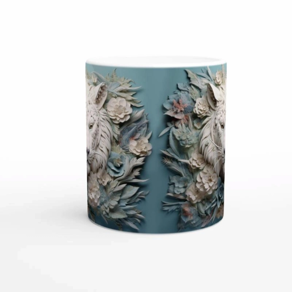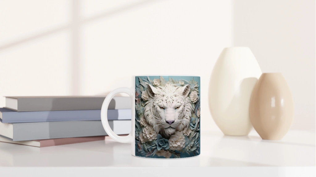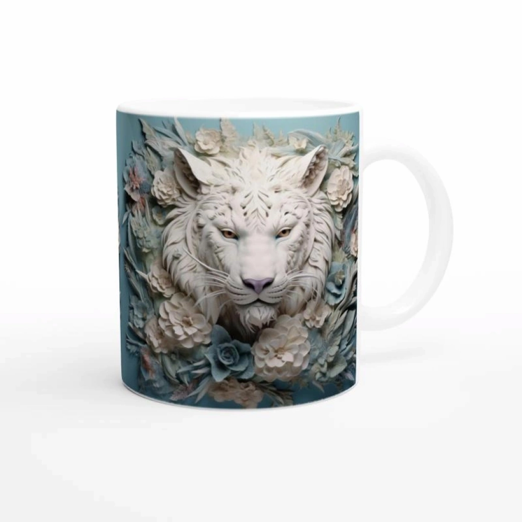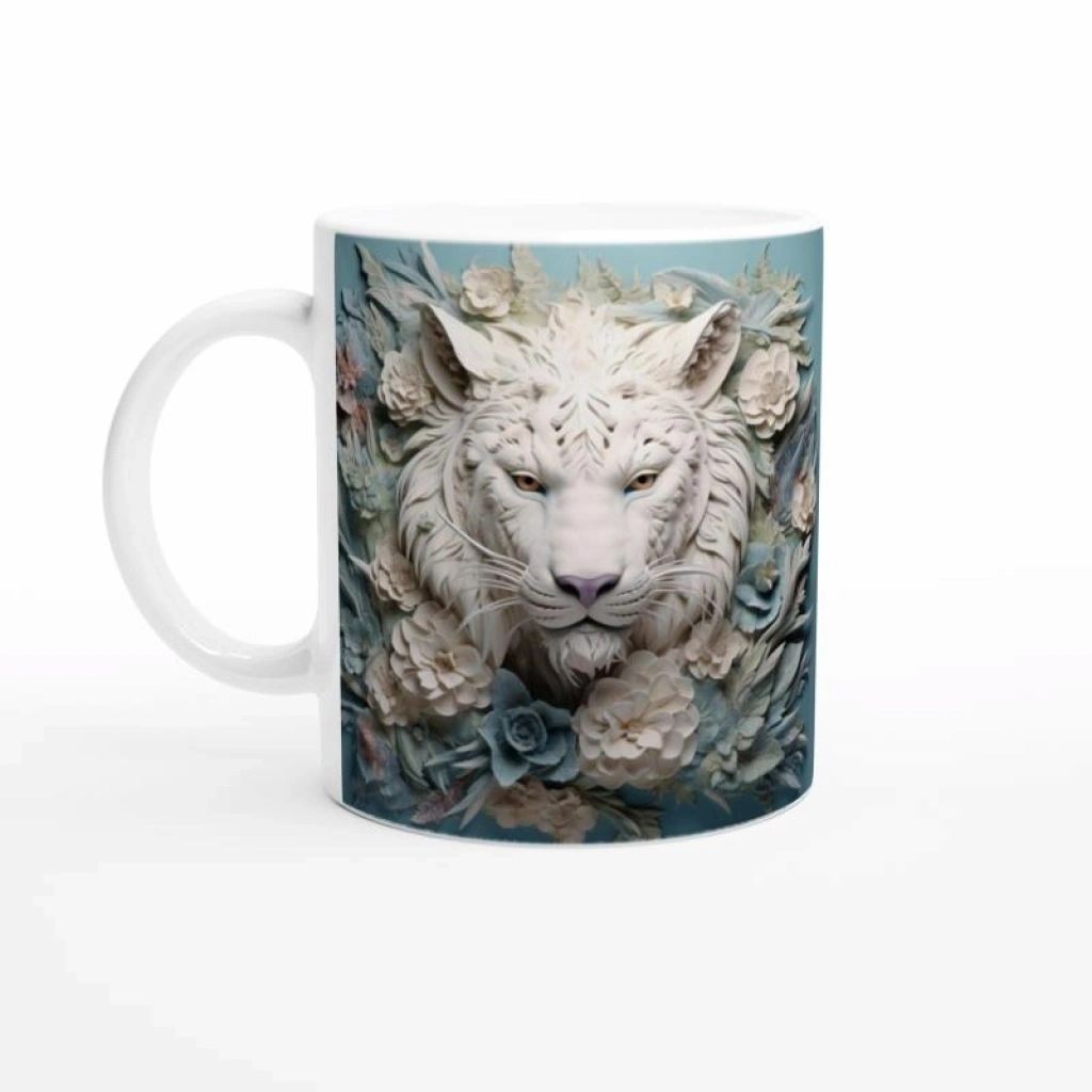 Buz tonlarında floral detaylarla çevrelenmiş beyaz kaplan illüstrasyonu, her yudumda vahşi doğanın büyüsünü yaşatıyor. Stil sahibi doğa tutkunlarına özel bir kupa tasarımı.